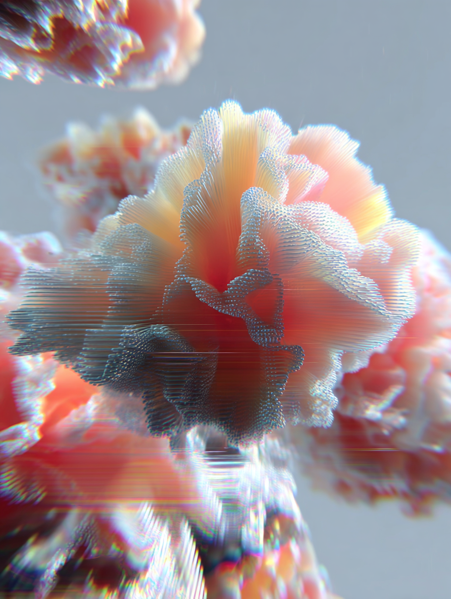 Abstract 3D art featuring vibrant, organic forms with intricate textures and warm color gradients on a neutral gray background.