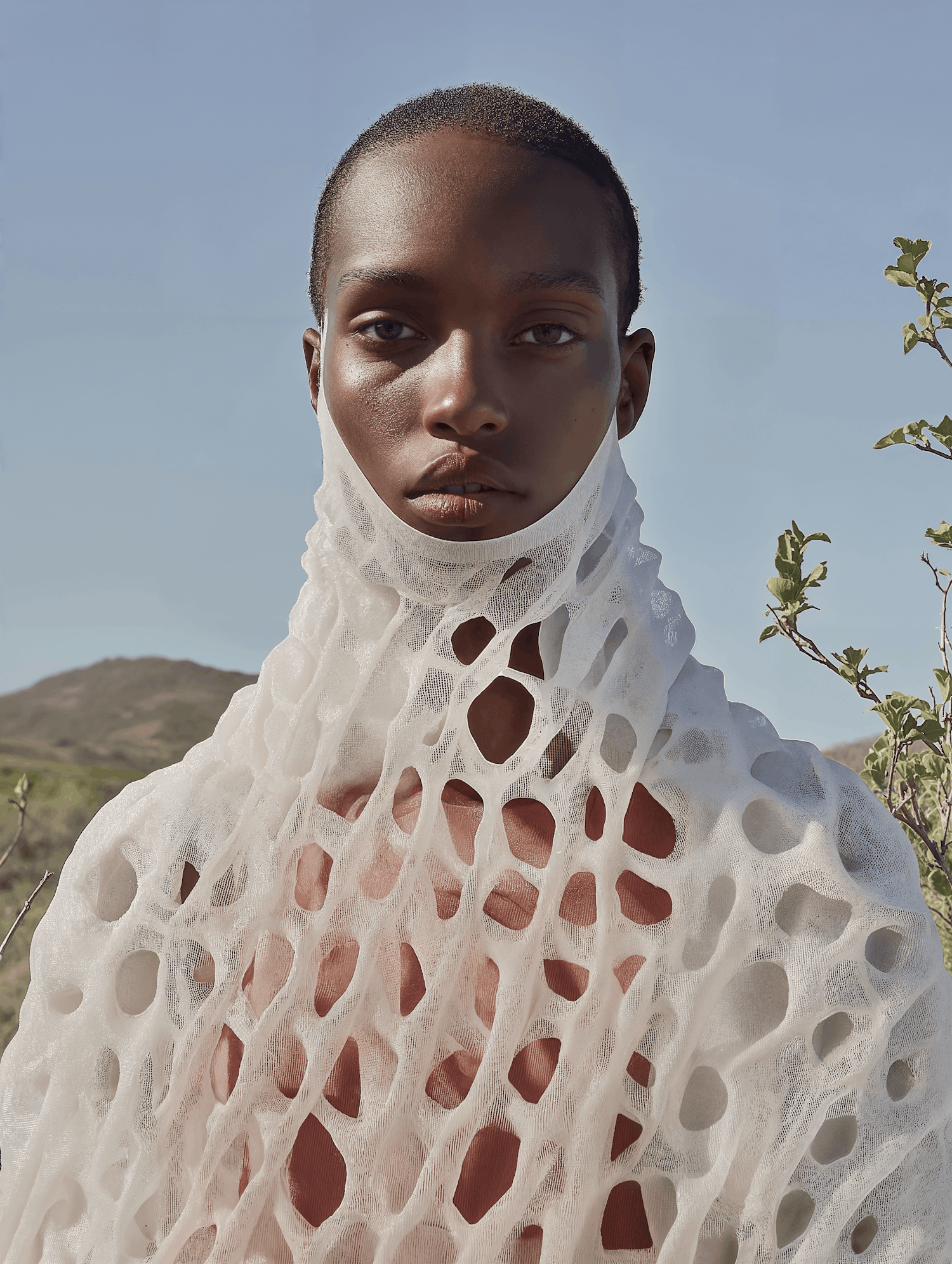 A captivating portrait of a person in a white net-like garment against a clear blue sky, blending fashion and nature seamlessly.