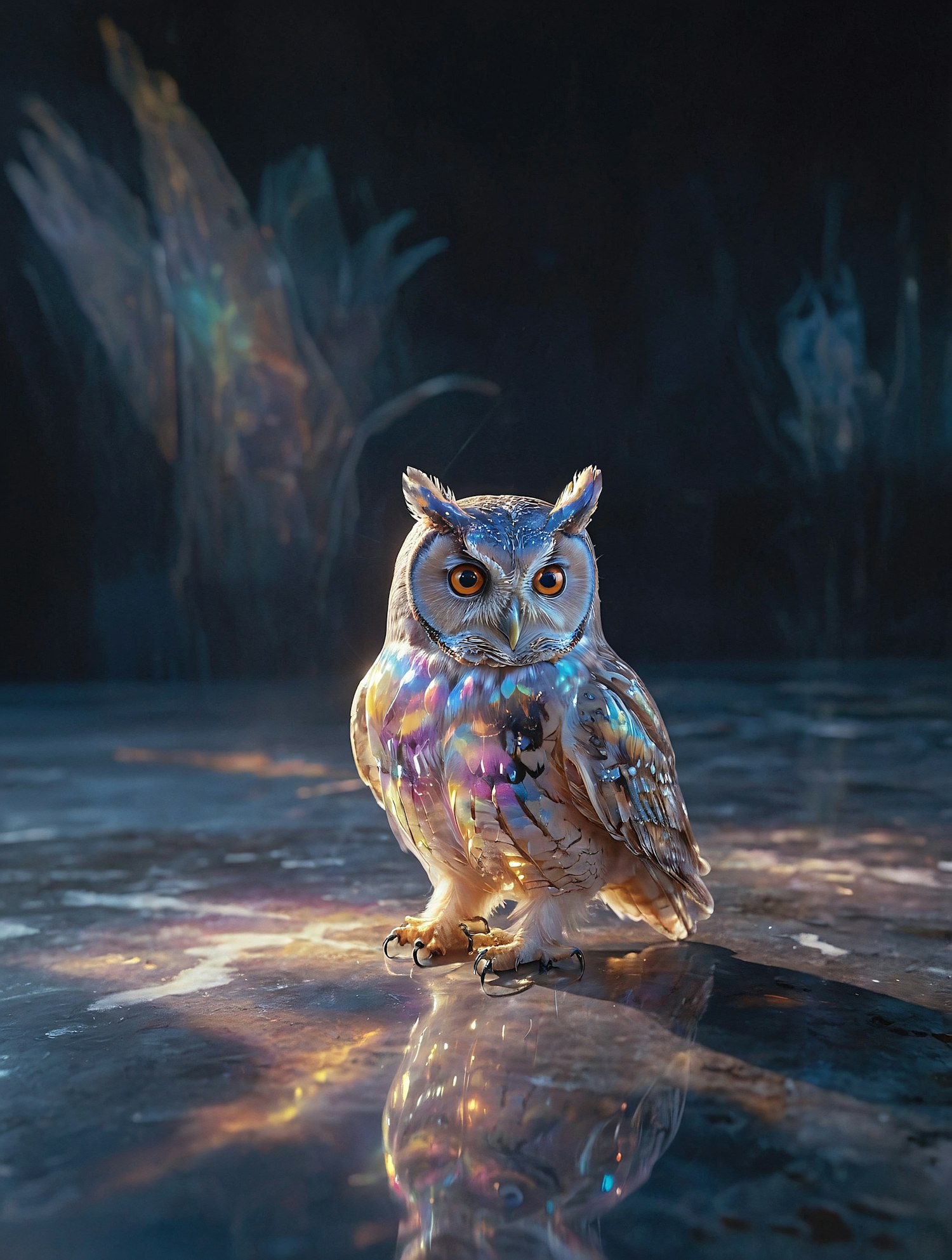 Iridescent owl sculpture with vibrant colors on a reflective surface, creating a magical and enchanting visual effect.