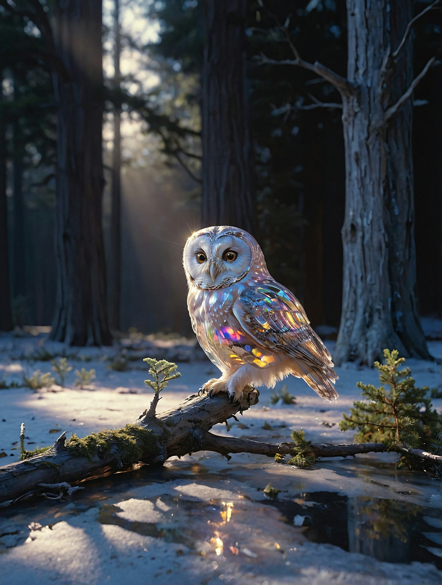 A stunning owl with iridescent feathers perches on a branch in a snowy forest, bathed in soft sunlight. Enchanting and serene.