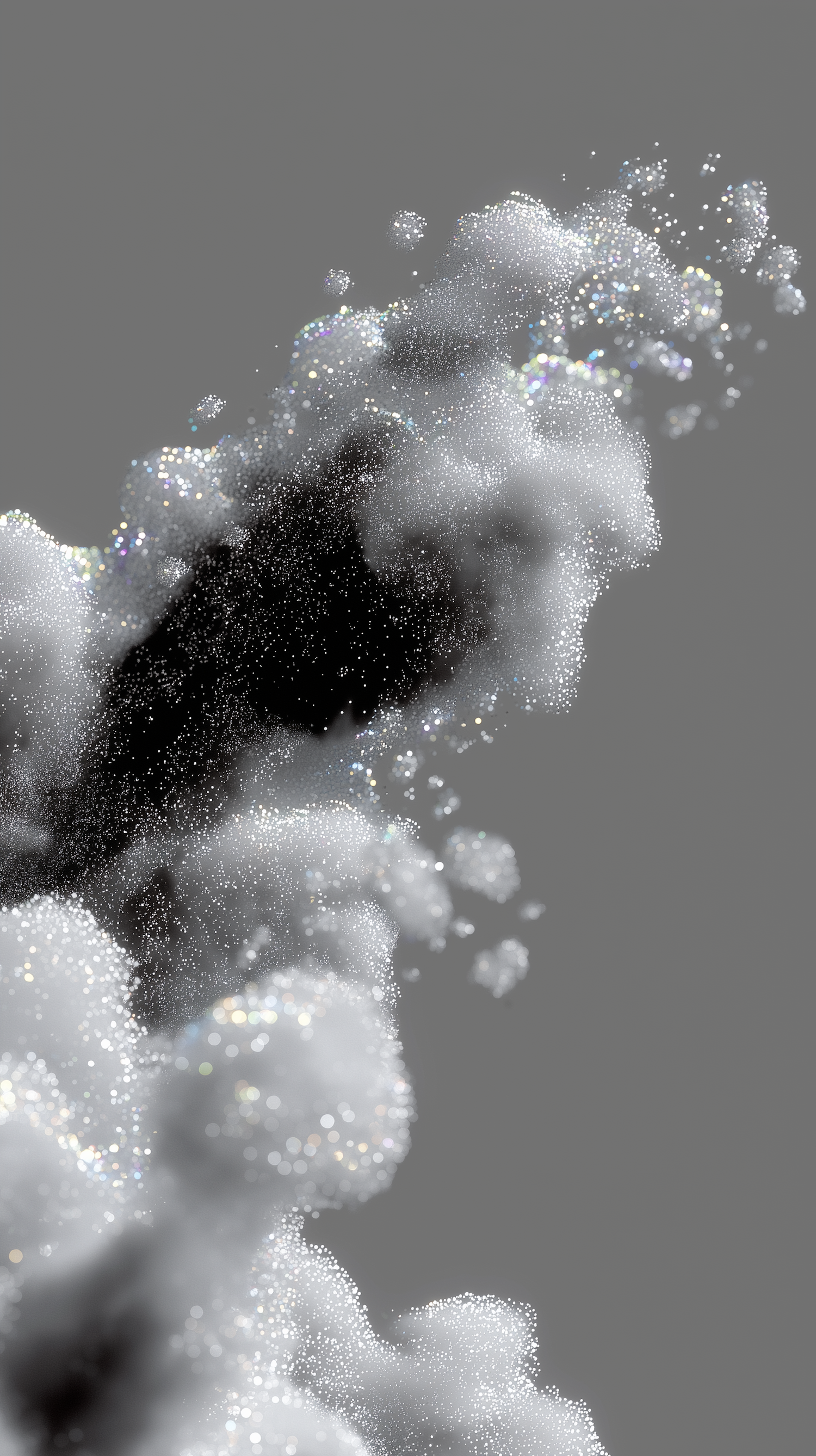 Abstract art of shimmering particles forming a cloud-like structure on a gray background, evoking a sense of movement and ethereal beauty.