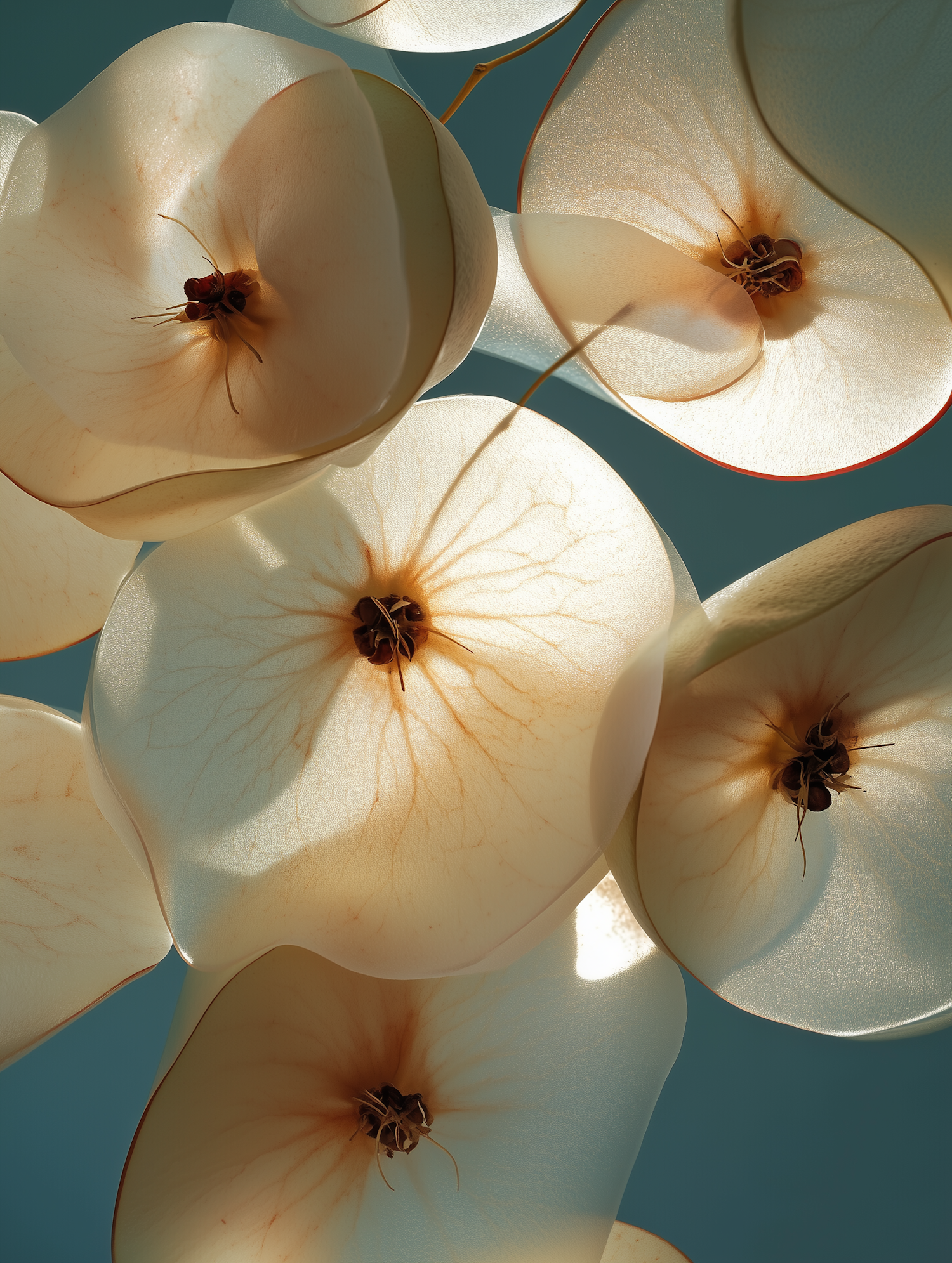 Ethereal close-up of translucent, petal-like forms with delicate veins and glowing light, set against a muted teal background.