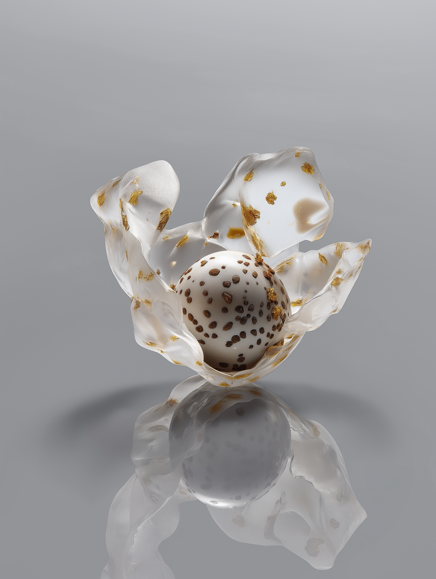 A translucent, petal-like structure with golden accents cradles a speckled sphere, creating an artistic and reflective composition.