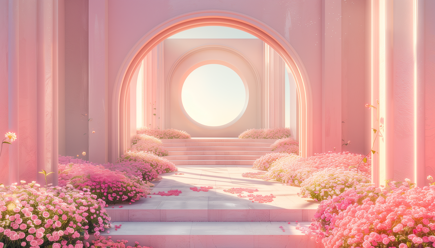 Ethereal pink arches and lush flowers create a serene, dreamlike pathway leading to a circular opening, bathed in soft light.