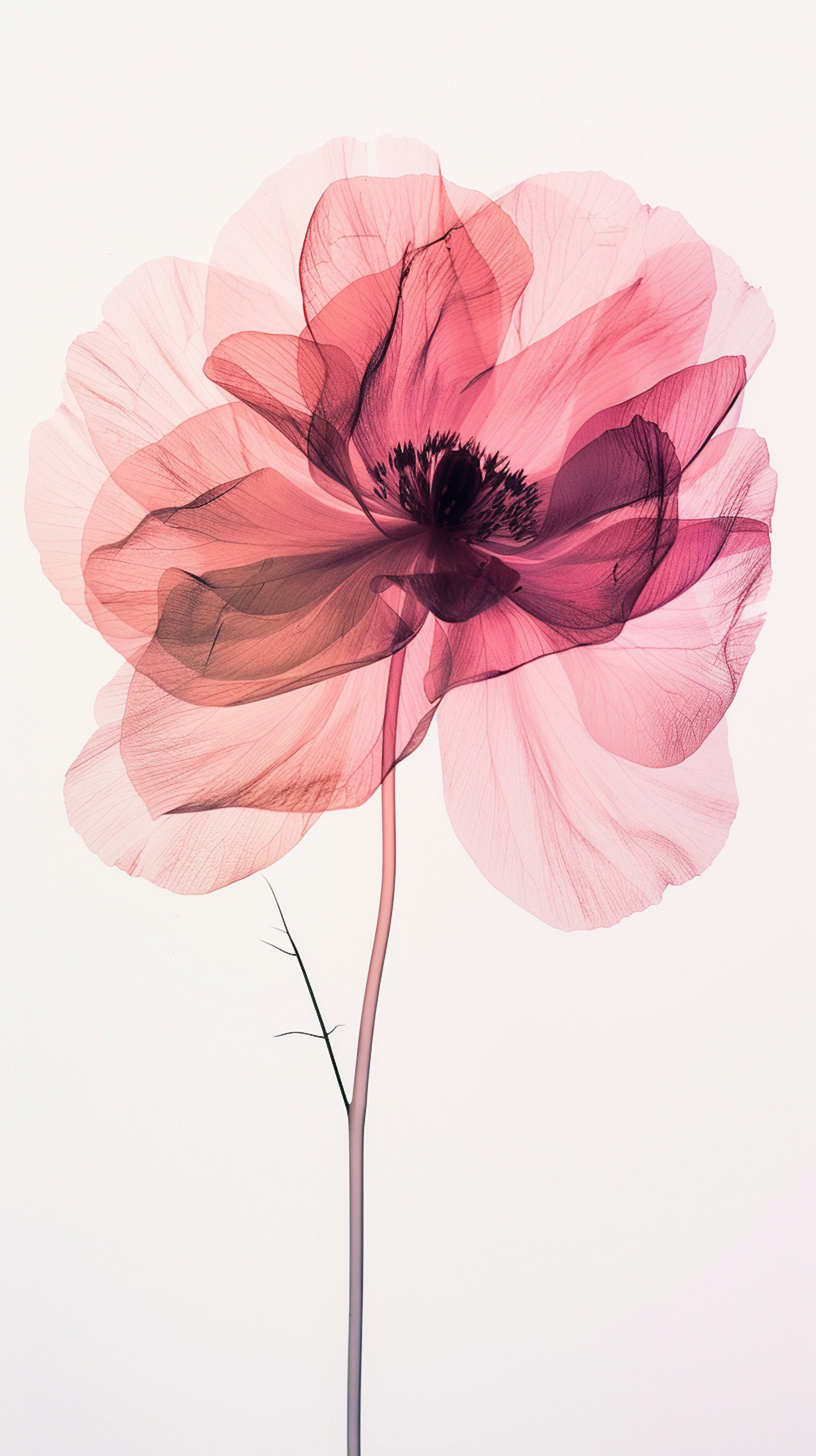 Translucent pink flower with delicate petals and dark center on a white background, showcasing natural beauty and elegance.