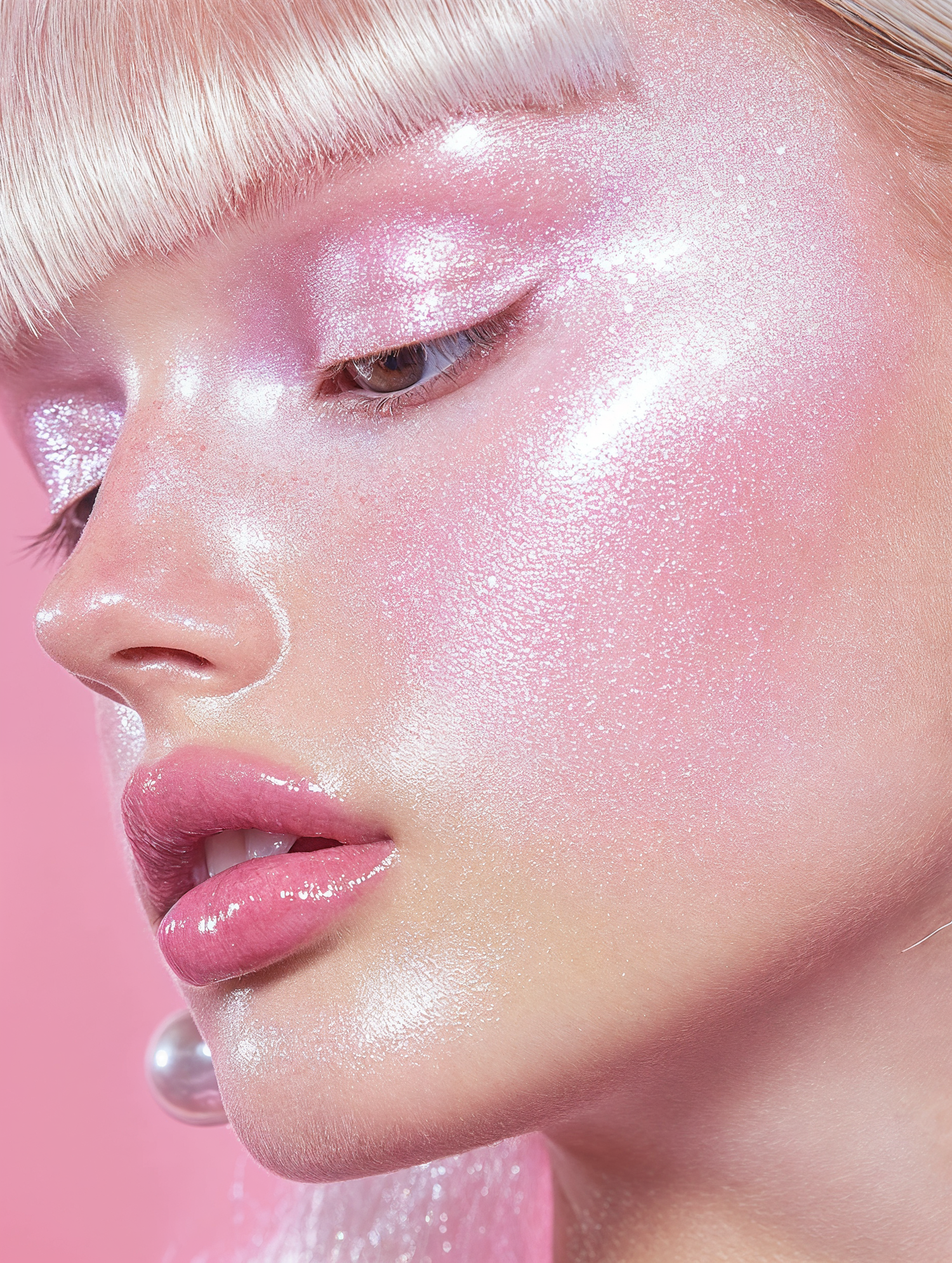 Close-up of a model with shimmering pink makeup, glossy lips, and platinum blonde hair against a soft pink background.