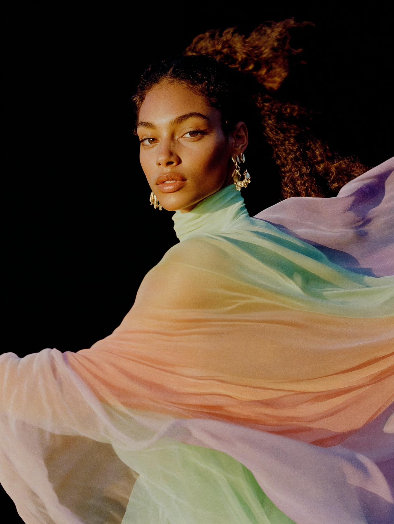 A stunning portrait of a woman in pastel gradient fabric, gold earrings, and a high ponytail, set against a dark background.