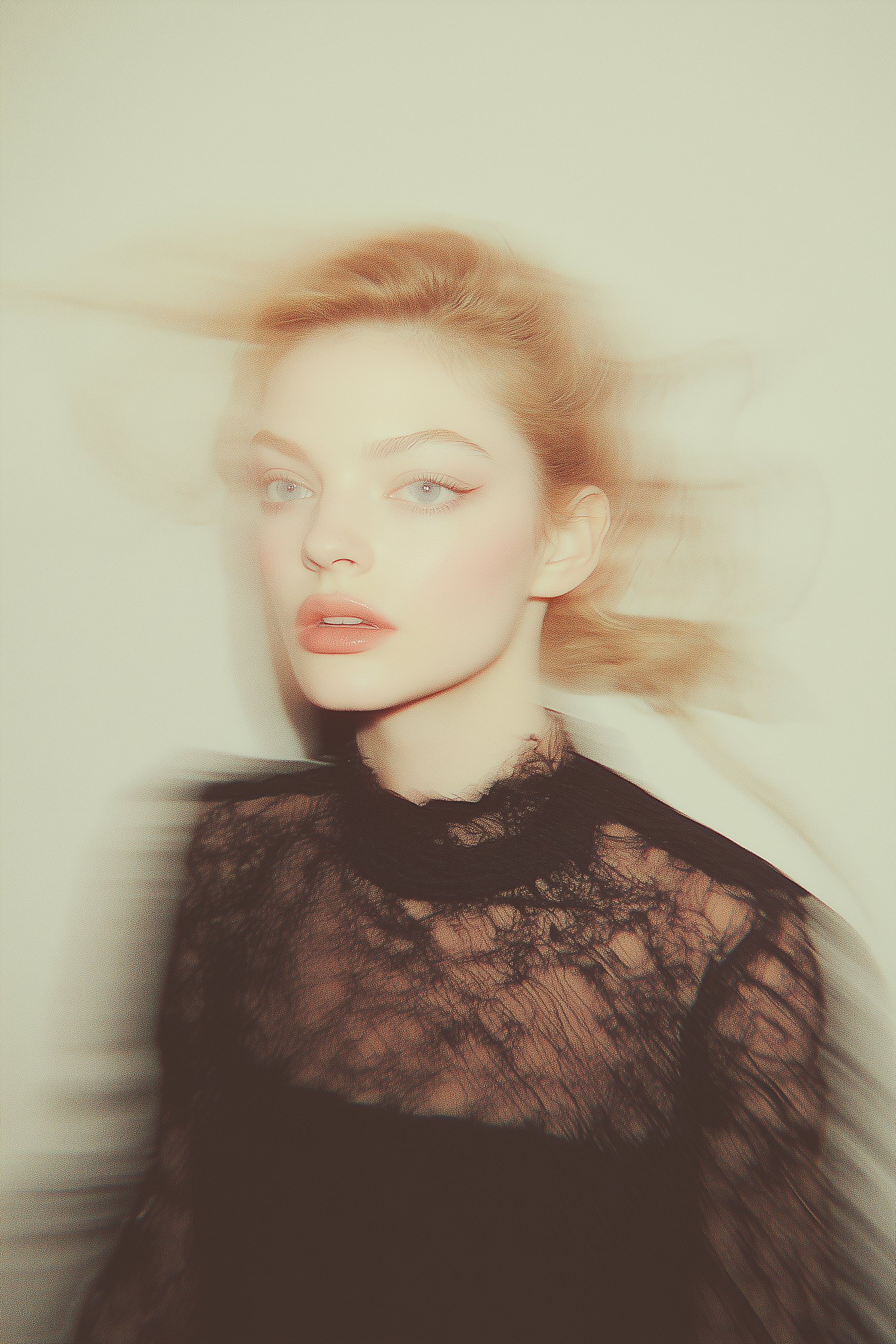 Dreamy portrait of a blonde woman in a black lace top, with motion blur adding an ethereal touch to her soft features and warm lighting.