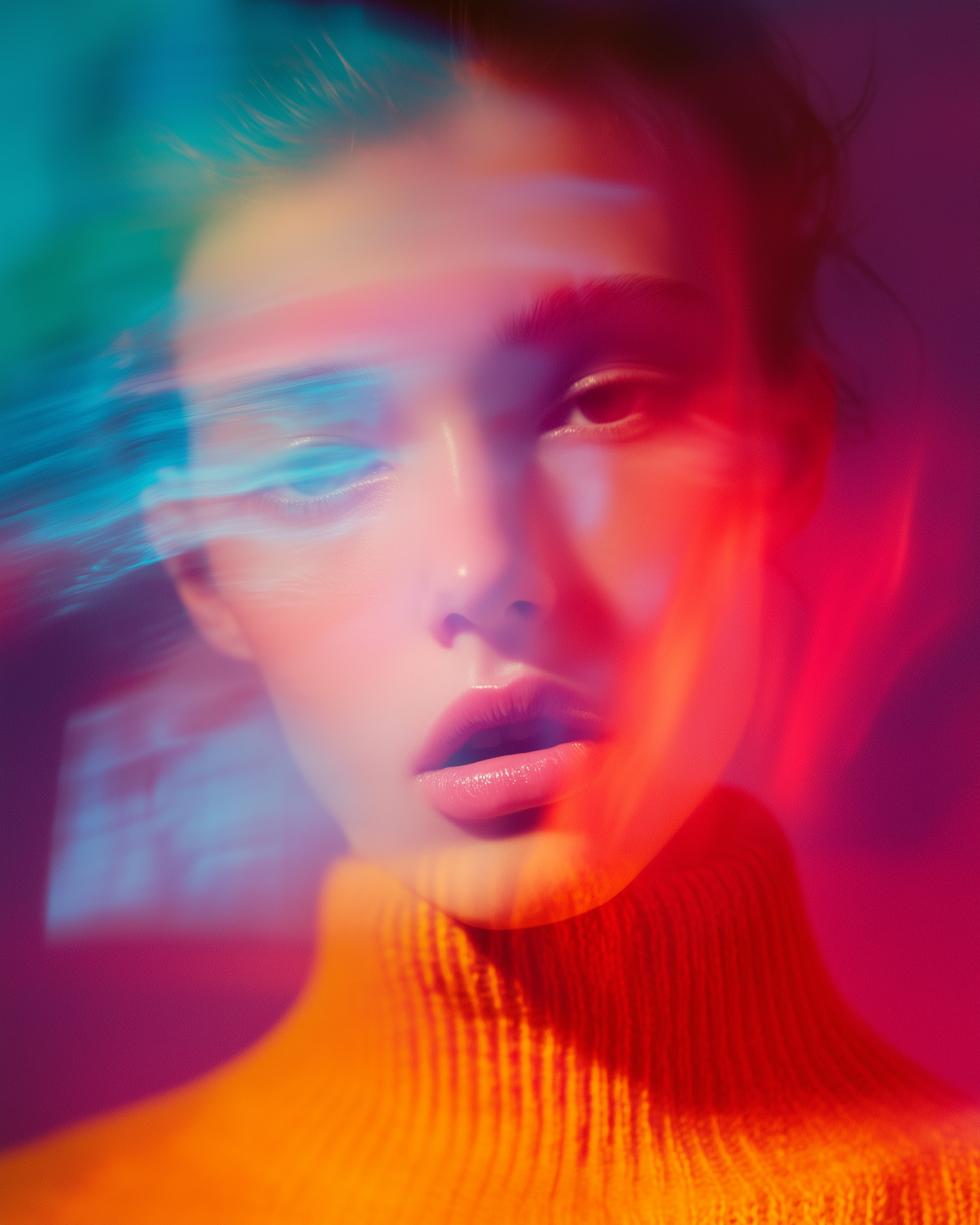 Ethereal portrait with vibrant colors and blurred effects, featuring a person in an orange turtleneck. Dreamy and abstract visual style.