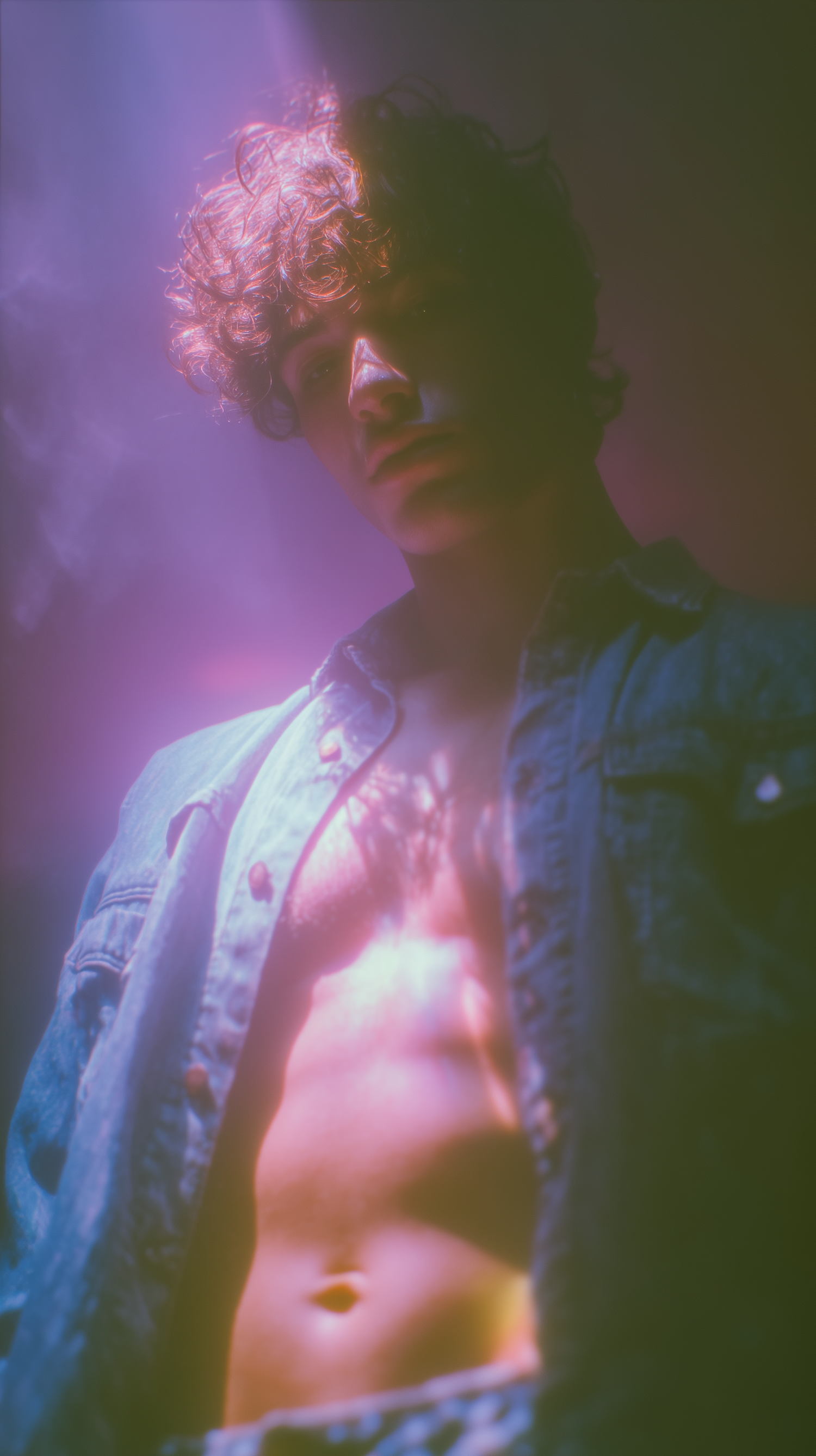 A dreamy portrait of a person in soft lighting, wearing a denim shirt, with purple and pink hues creating an ethereal atmosphere.