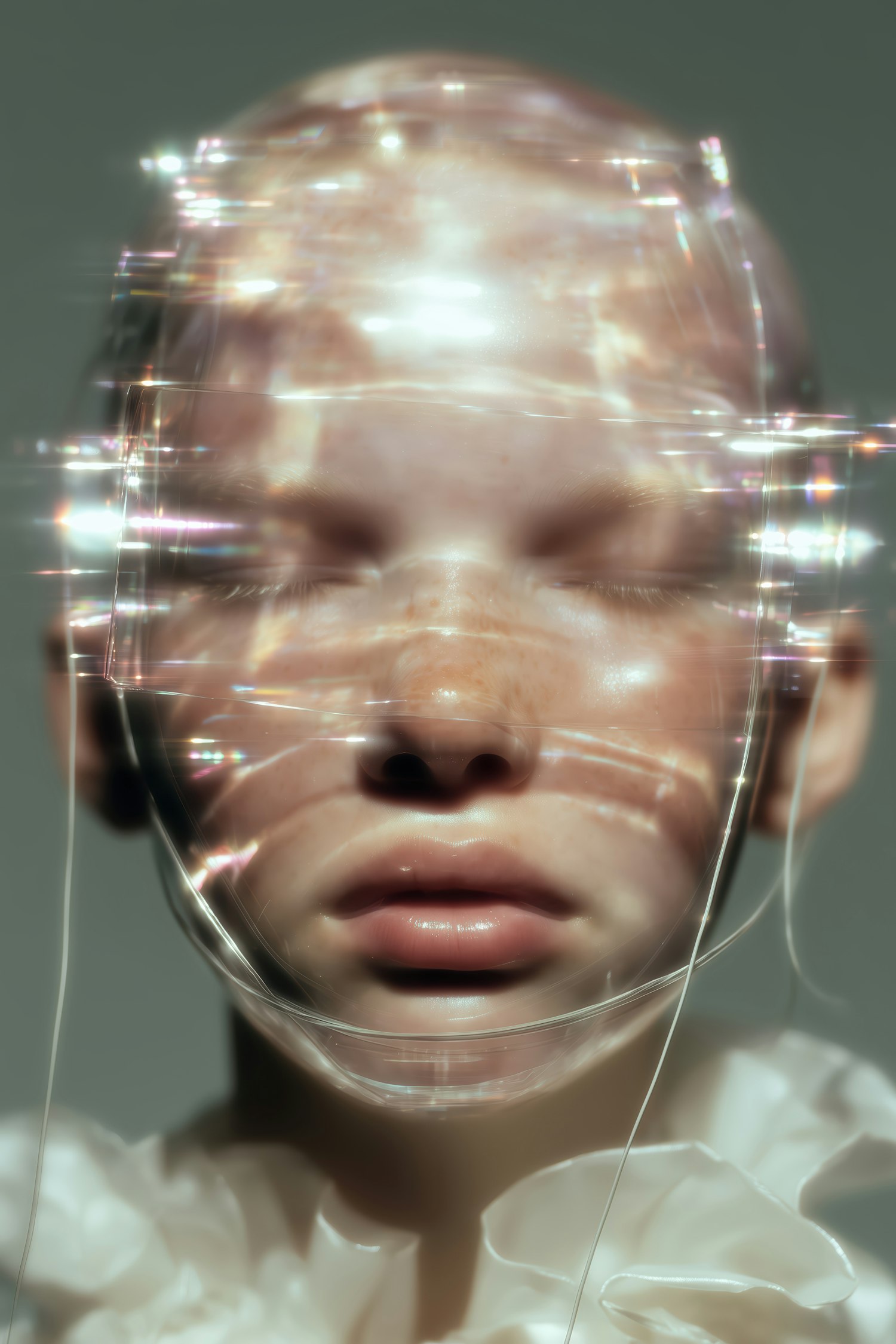 A surreal close-up of a freckled face with refracted light effects, glossy lips, and a translucent covering, creating an artistic vibe.