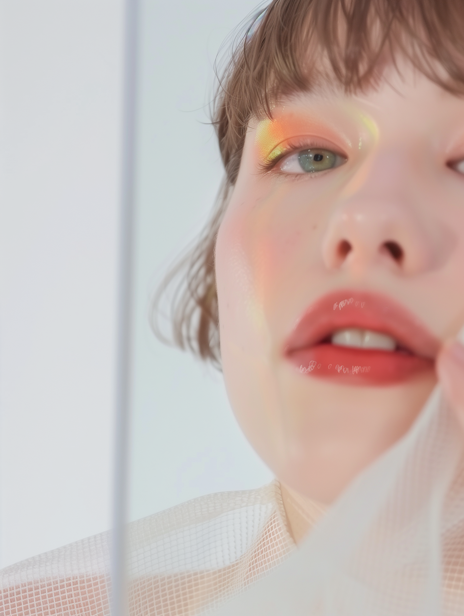 Close-up of a woman with vibrant orange eyeshadow, coral lips, and soft lighting, featuring a sheer white mesh fabric and rainbow reflections.