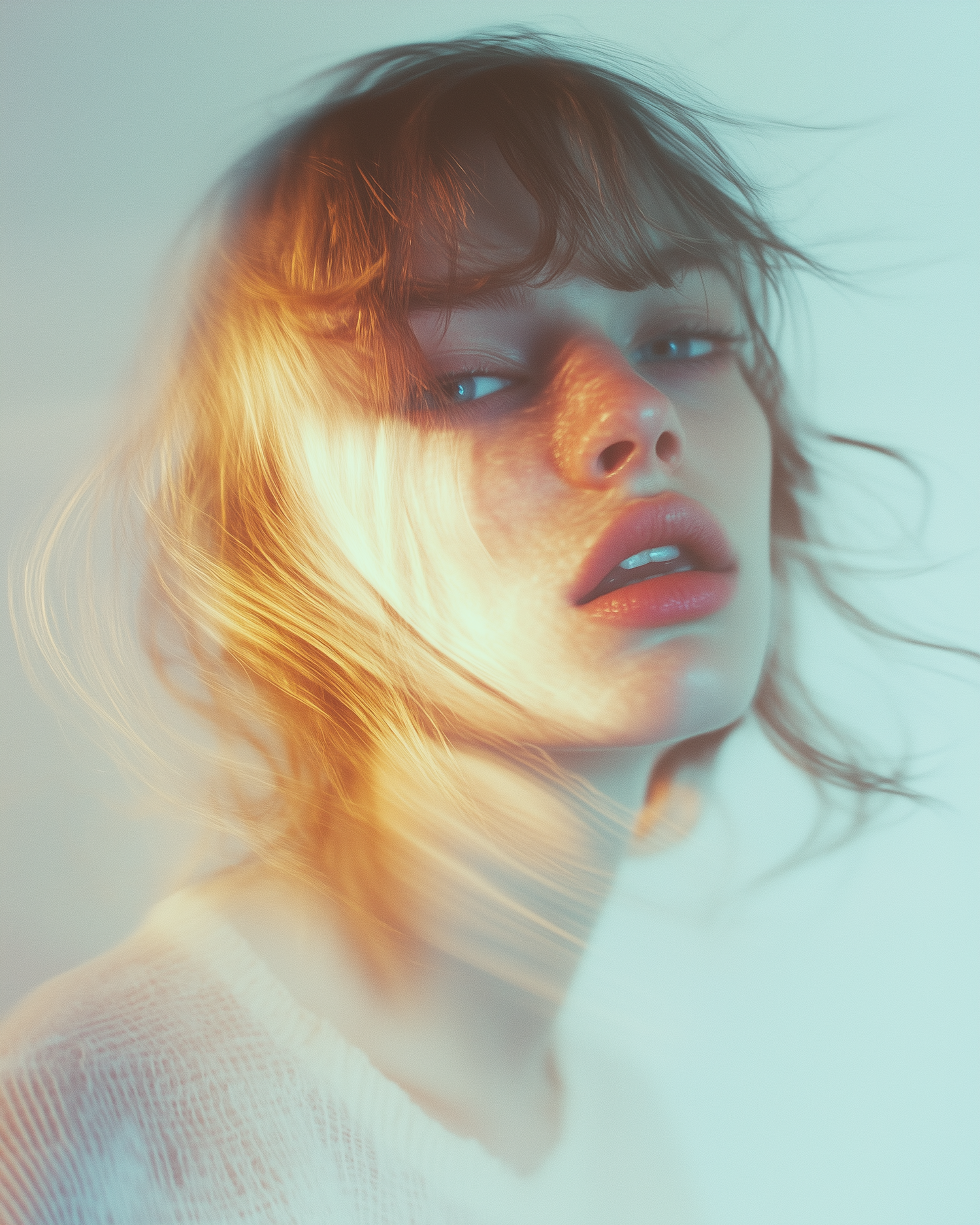 Ethereal portrait of a young woman with light brown hair and blue eyes, captured in soft, warm lighting for a dreamy effect.