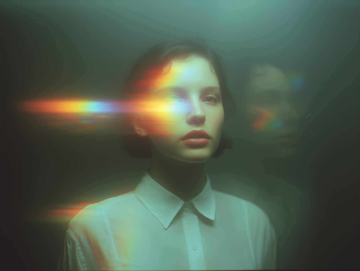A surreal portrait of a woman with rainbow light effects and a reflective background, creating a dreamy and artistic atmosphere.