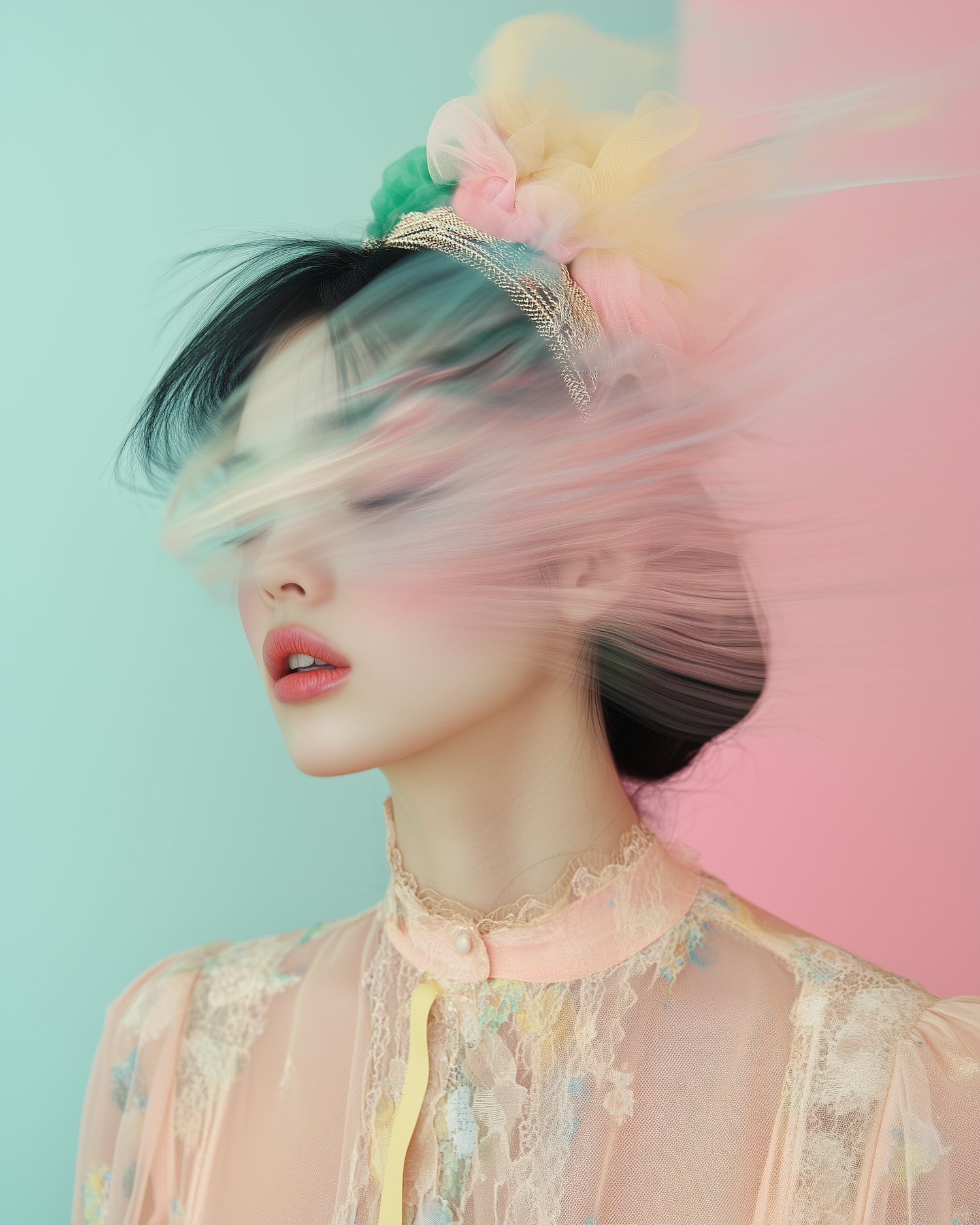 Ethereal portrait of a woman with a colorful tulle headpiece and pastel lace blouse, set against a dreamy teal and pink background.