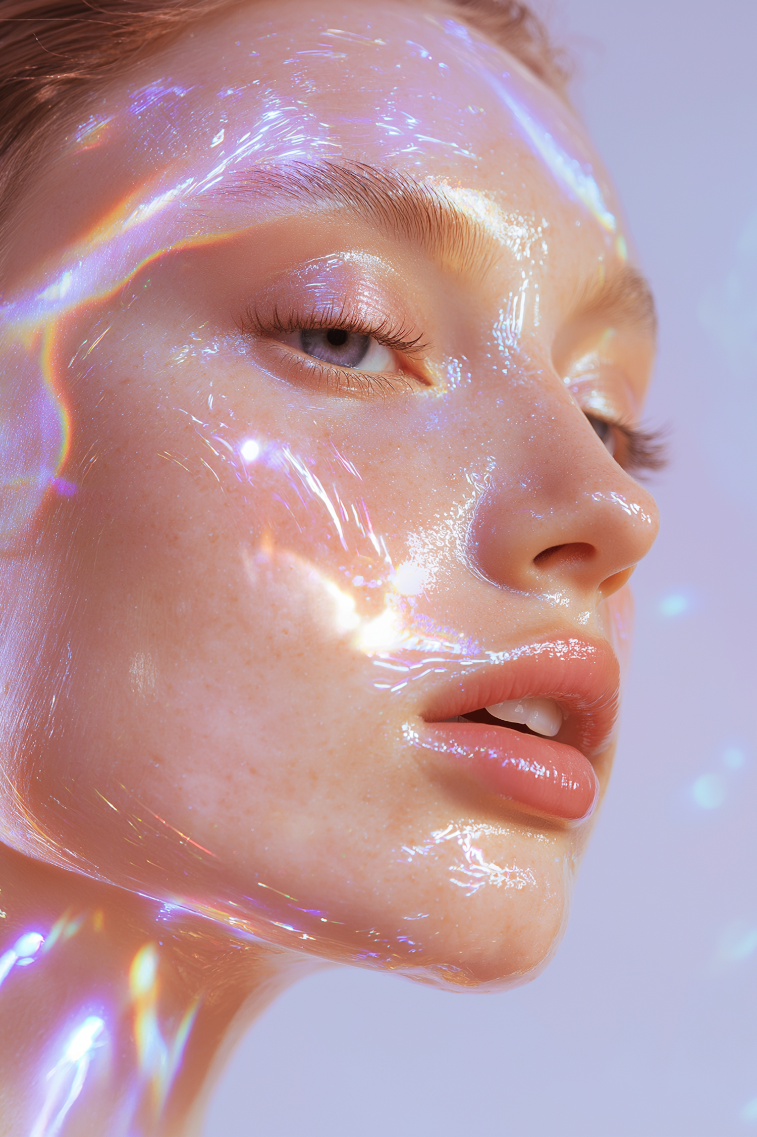 Close-up of glowing, freckled skin with iridescent light reflections, dewy texture, and soft lavender background for an ethereal vibe.