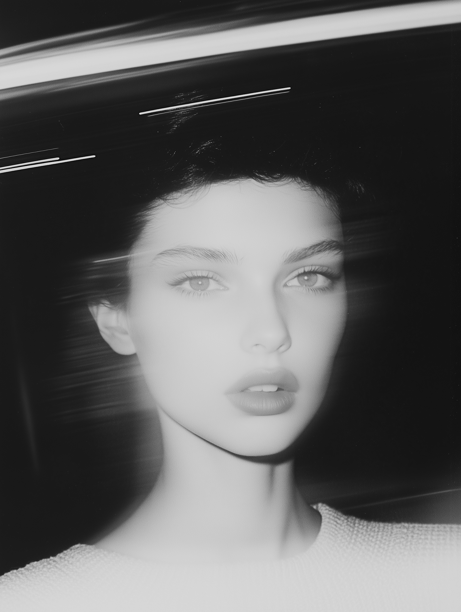 Ethereal black and white portrait of a young woman with short dark hair and light eyes, exuding a serene and contemplative expression.