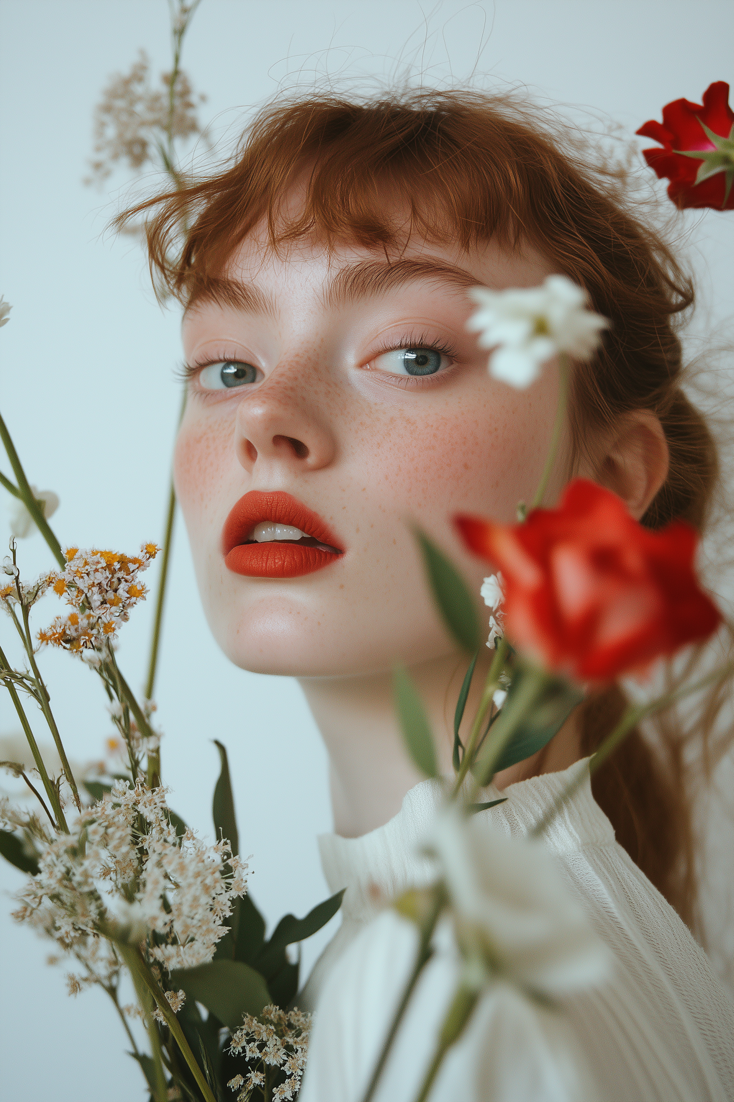 A freckled woman with auburn hair and red lipstick surrounded by vibrant flowers, creating a soft and artistic portrait.