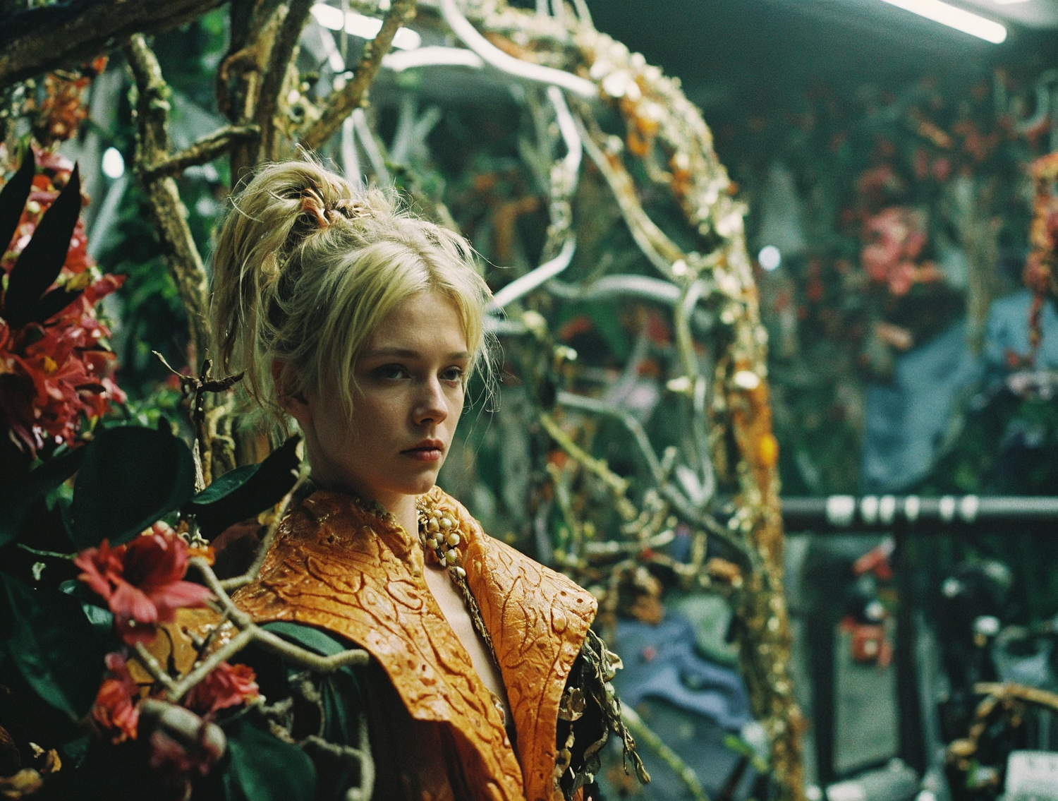 A young woman in ornate orange attire stands amidst lush branches and red flowers, creating a mystical, otherworldly scene.