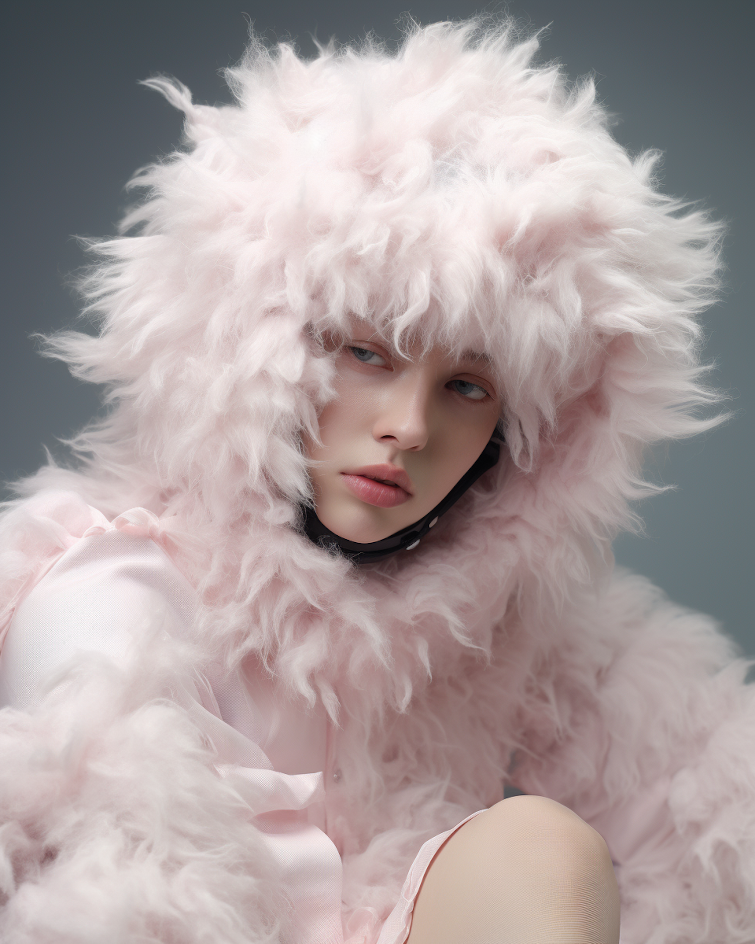 A serene portrait of a person in a fluffy pink fur-like outfit, with a calm expression and light blue eyes against a muted gray background.