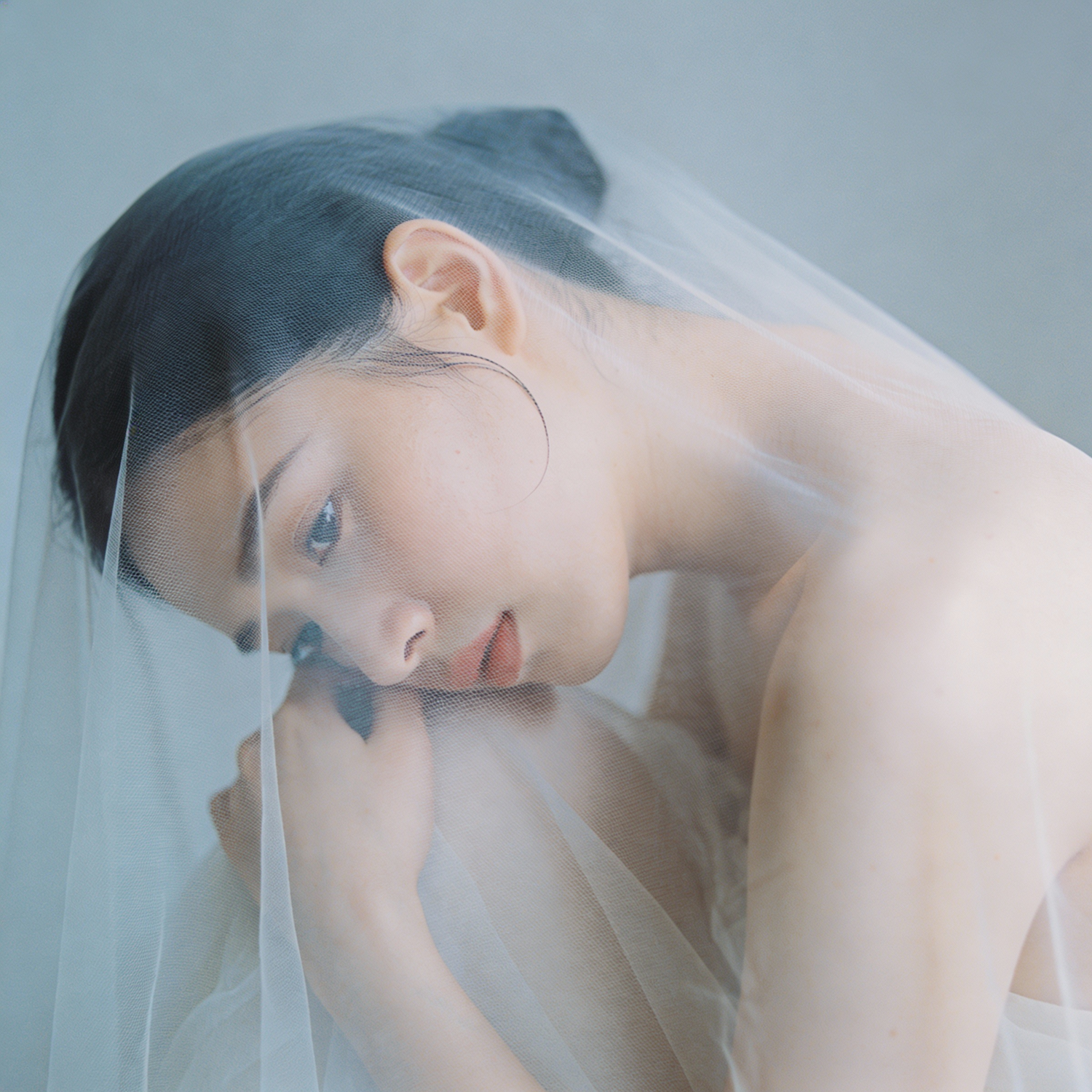 Soft editorial photography, calm and cold color palette, diffused natural light, low contrast, desaturated tones, subtle grain, shallow depth of field, soft textures, airy composition, quiet atmosphere, minimalist styling, poetic and contemplative mood, realistic photographic rendering, close interaction between skin and a delicate translucent material, textures blending together, fine folds and lines, organic and tactile feeling, no clear boundary between body and surface