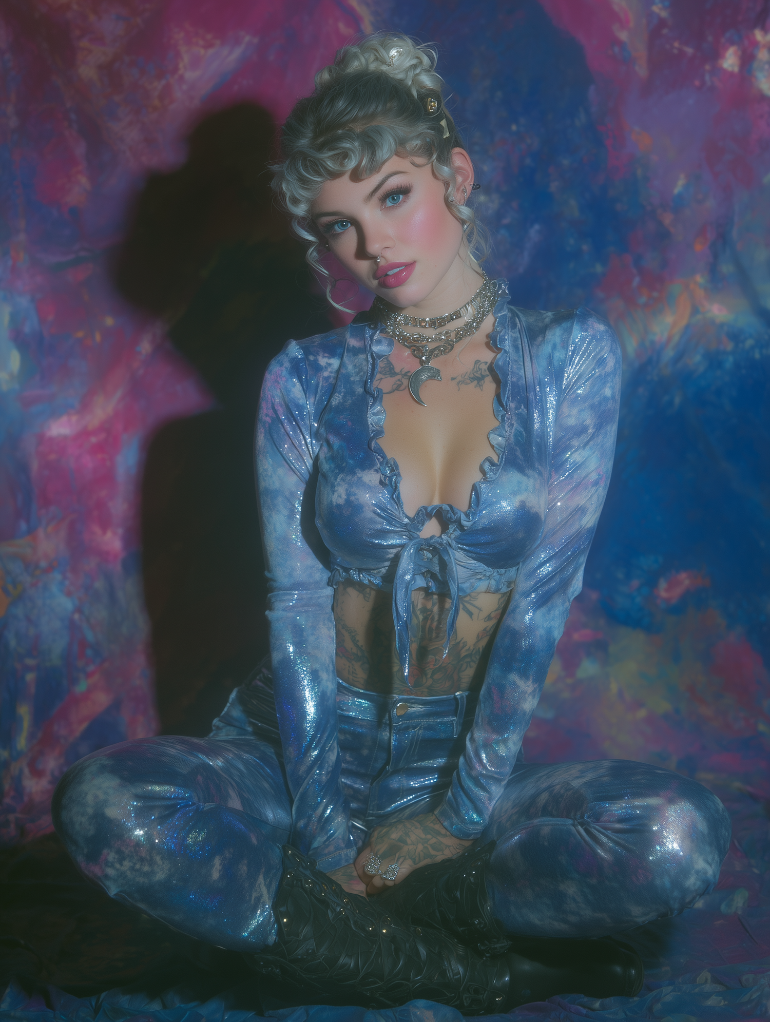 A person in a shimmering blue and purple outfit sits cross-legged against a vibrant background, exuding a dreamy and artistic vibe.