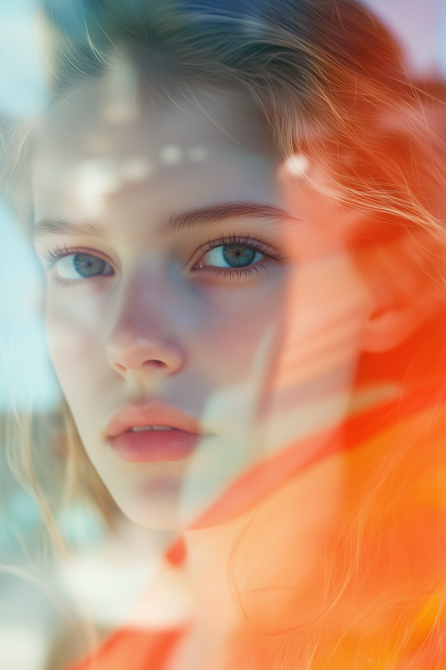 Dreamy close-up of a young woman with blue eyes and blonde hair, bathed in soft orange and blue light for an ethereal effect.