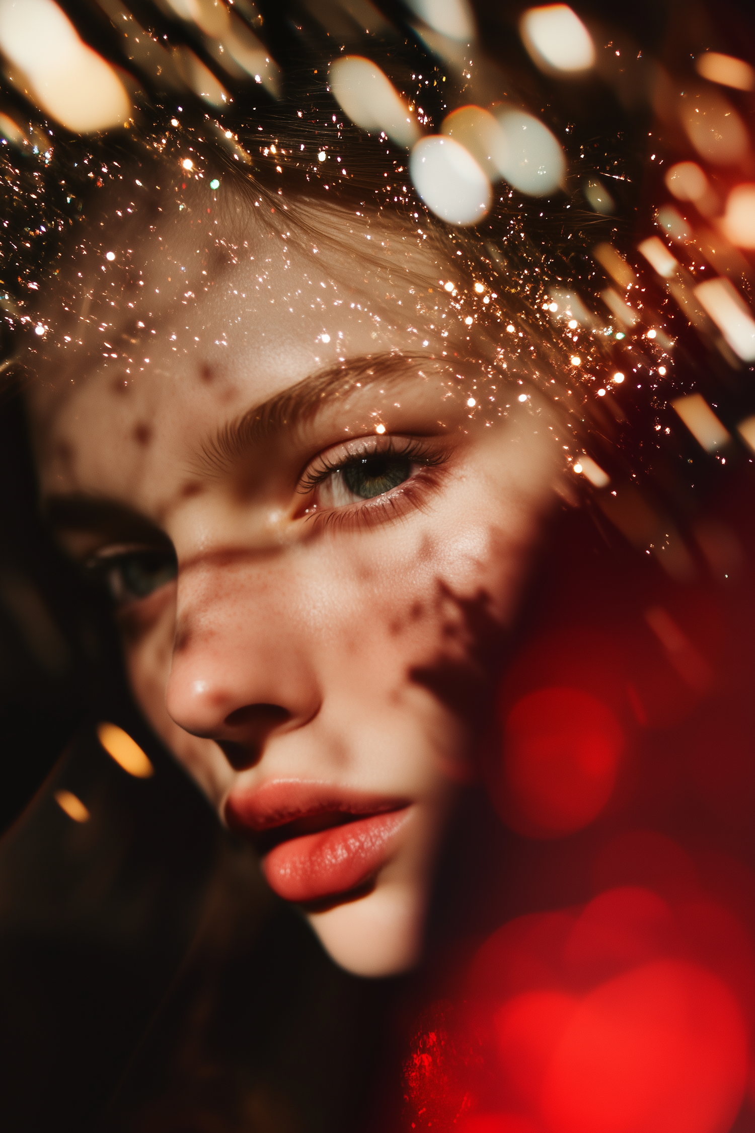 Ethereal close-up portrait with sparkling bokeh lights, highlighting a woman's serene expression and striking green eyes.