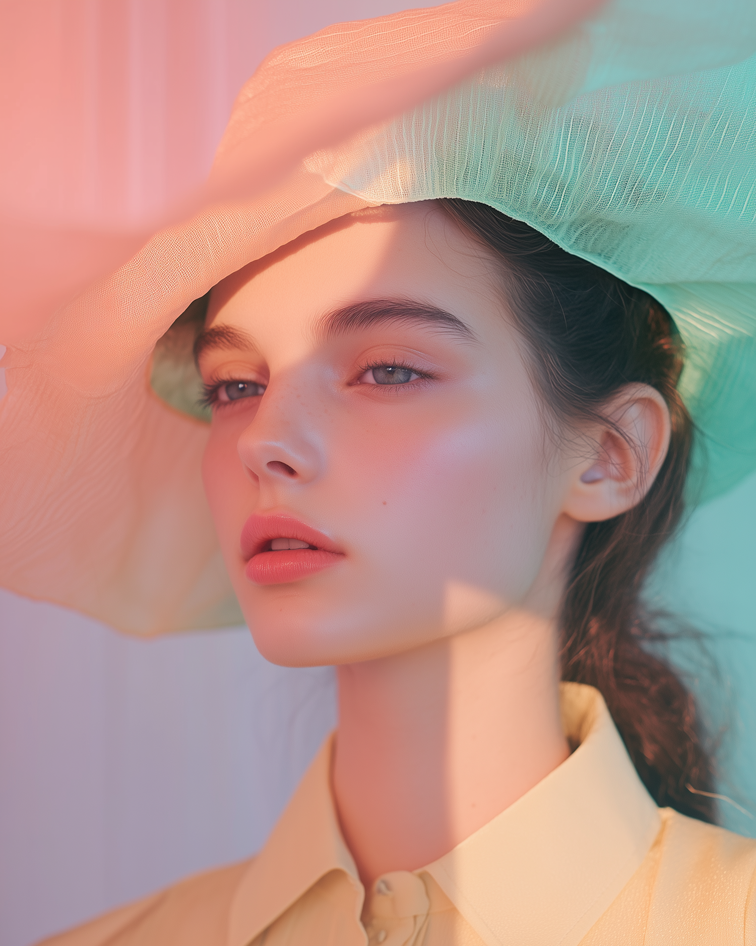 Elegant portrait of a young woman in a pastel hat and yellow blouse, with soft lighting and a serene expression.