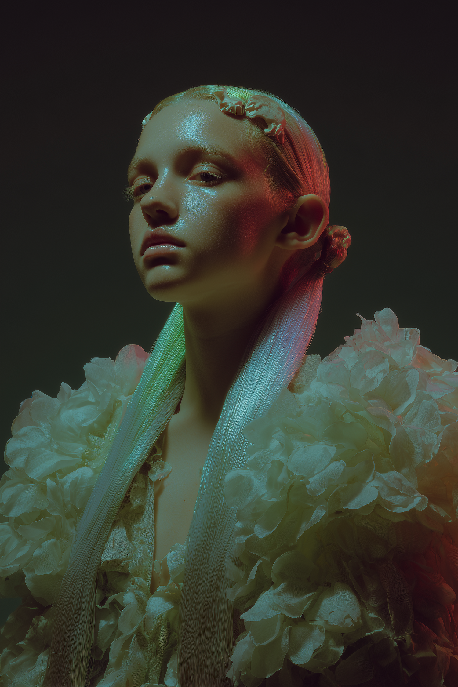Ethereal portrait of a person in a floral-textured outfit, illuminated by artistic green and red lighting against a dark background.