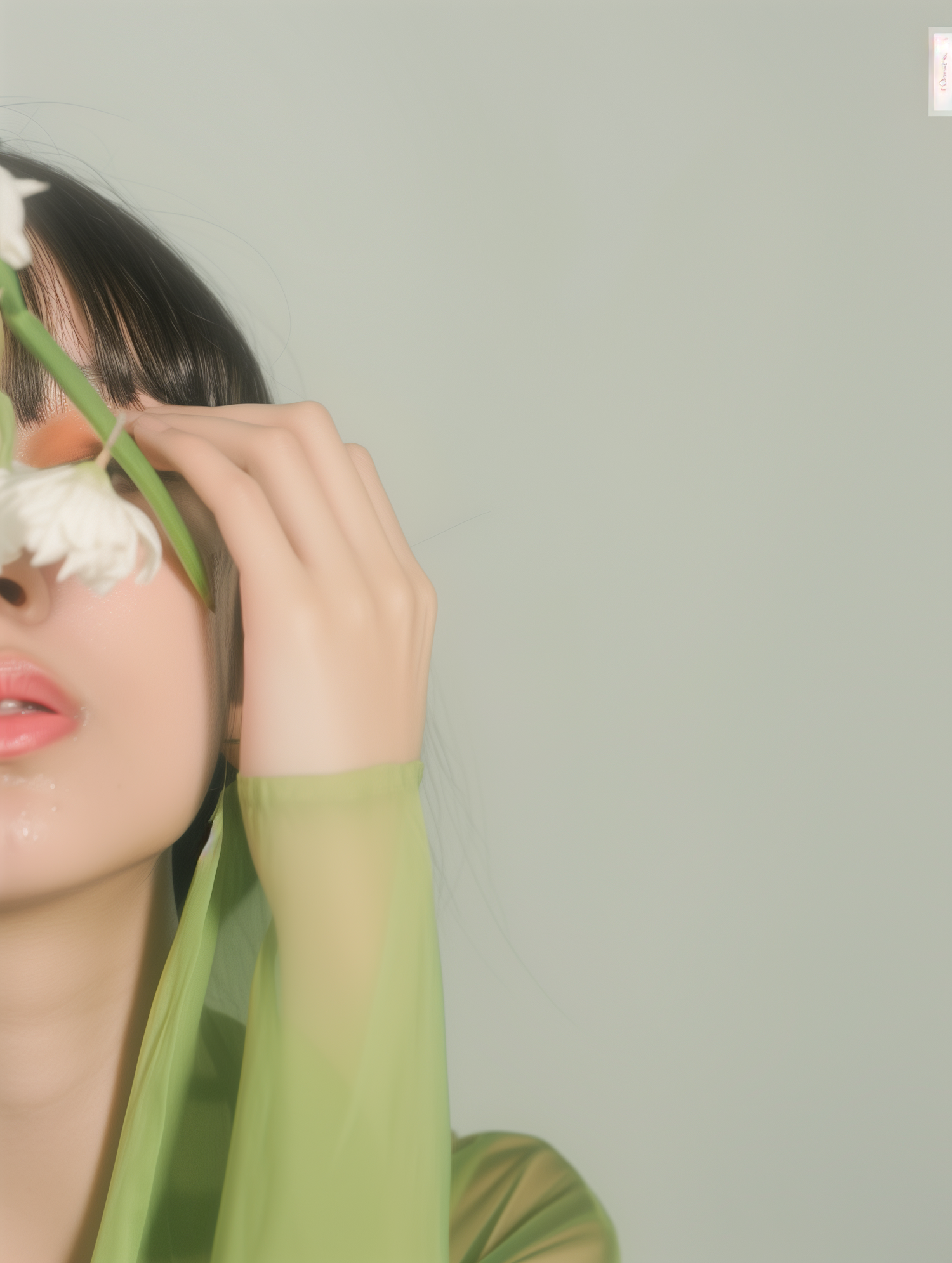Dreamy close-up of a person with glossy lips, sheer green fabric, and white flowers against a pastel green background.