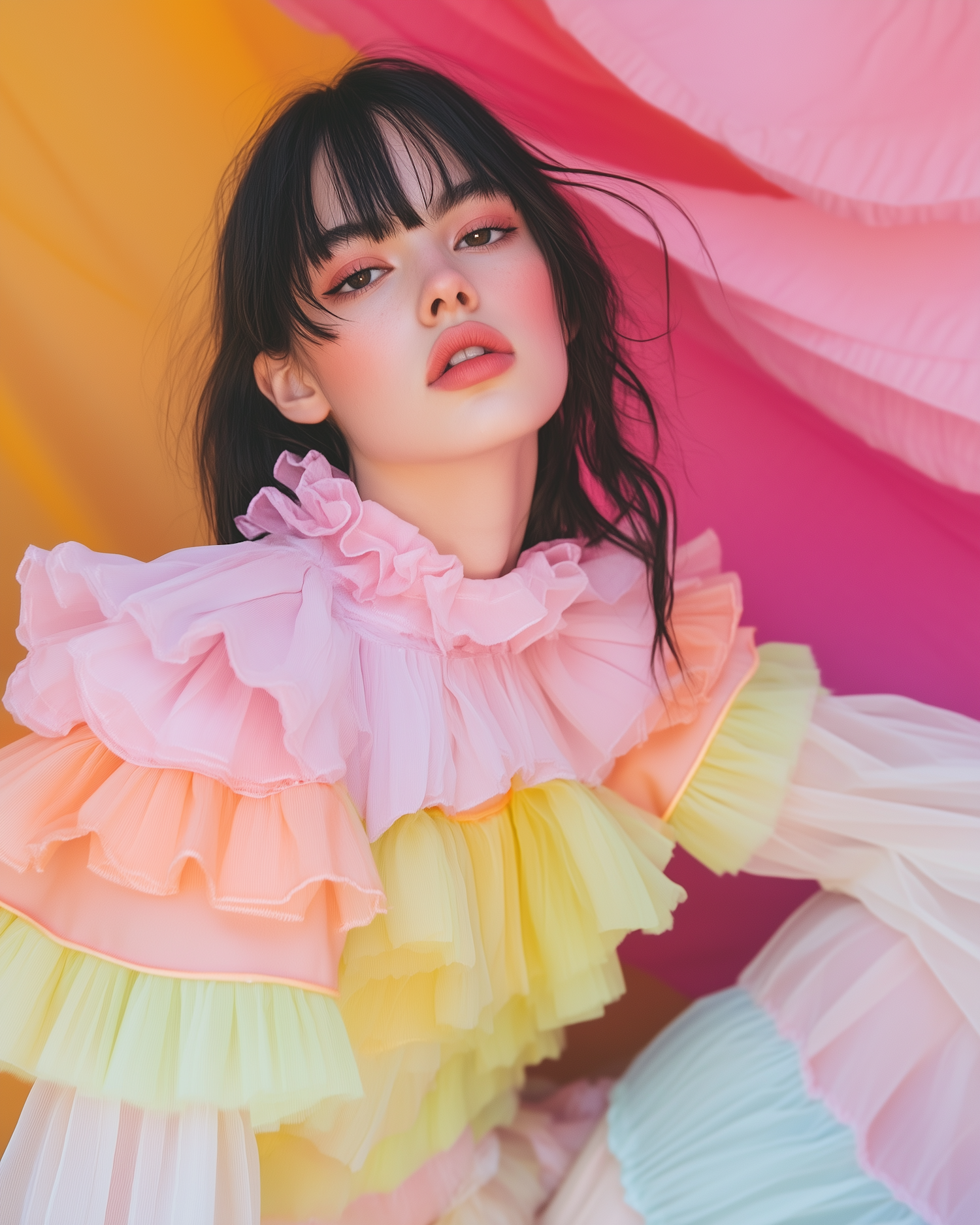 Asian woman in a colorful ruffled dress poses against a vibrant pink and orange background, exuding confidence and style.