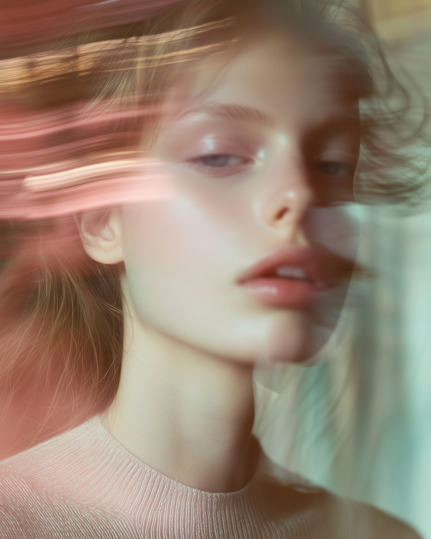 Ethereal portrait of a young woman with flowing hair and soft pastel colors, creating a dreamy, abstract effect.