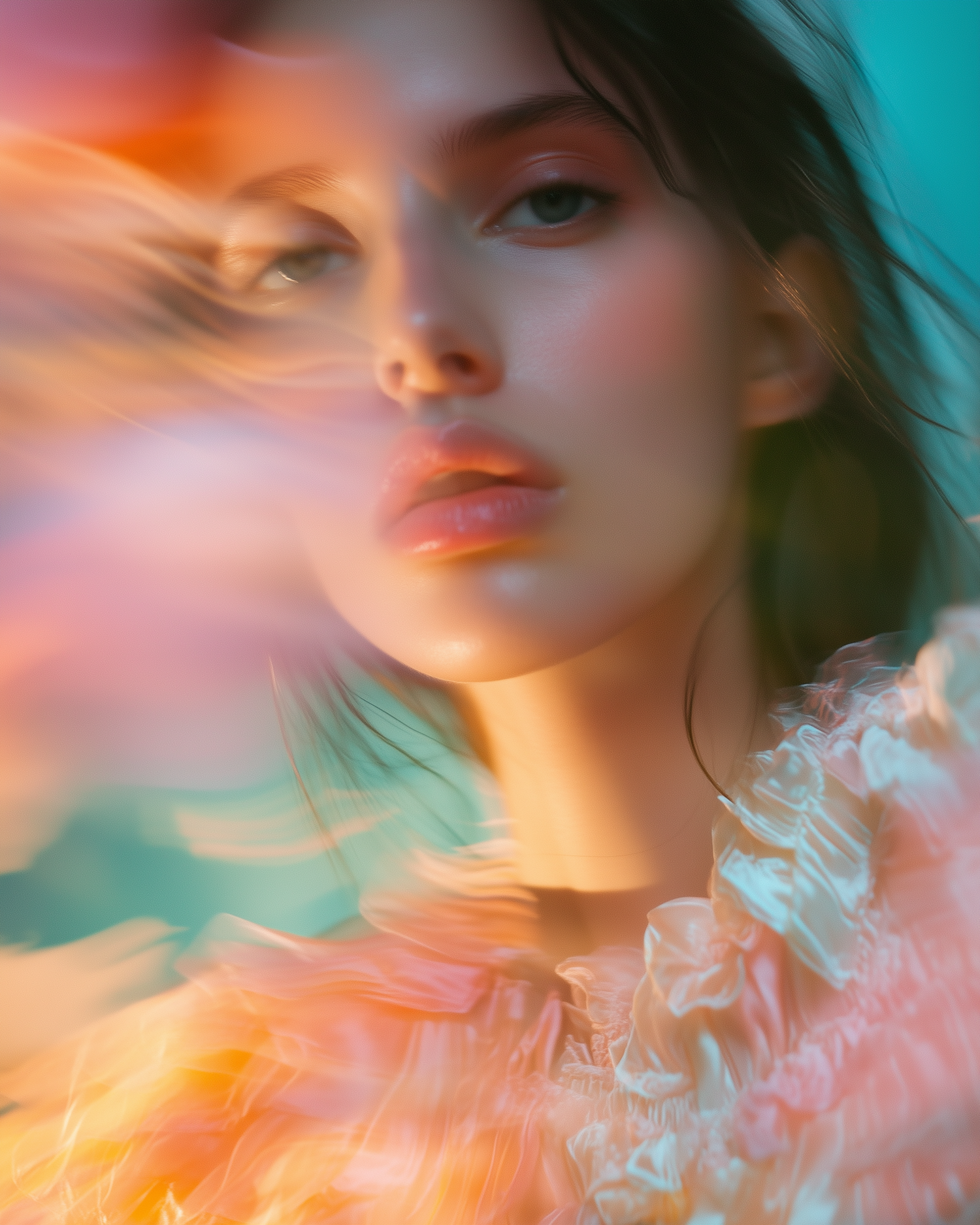 Ethereal portrait of a woman with vibrant colors and soft focus, creating a dreamy, surreal atmosphere.