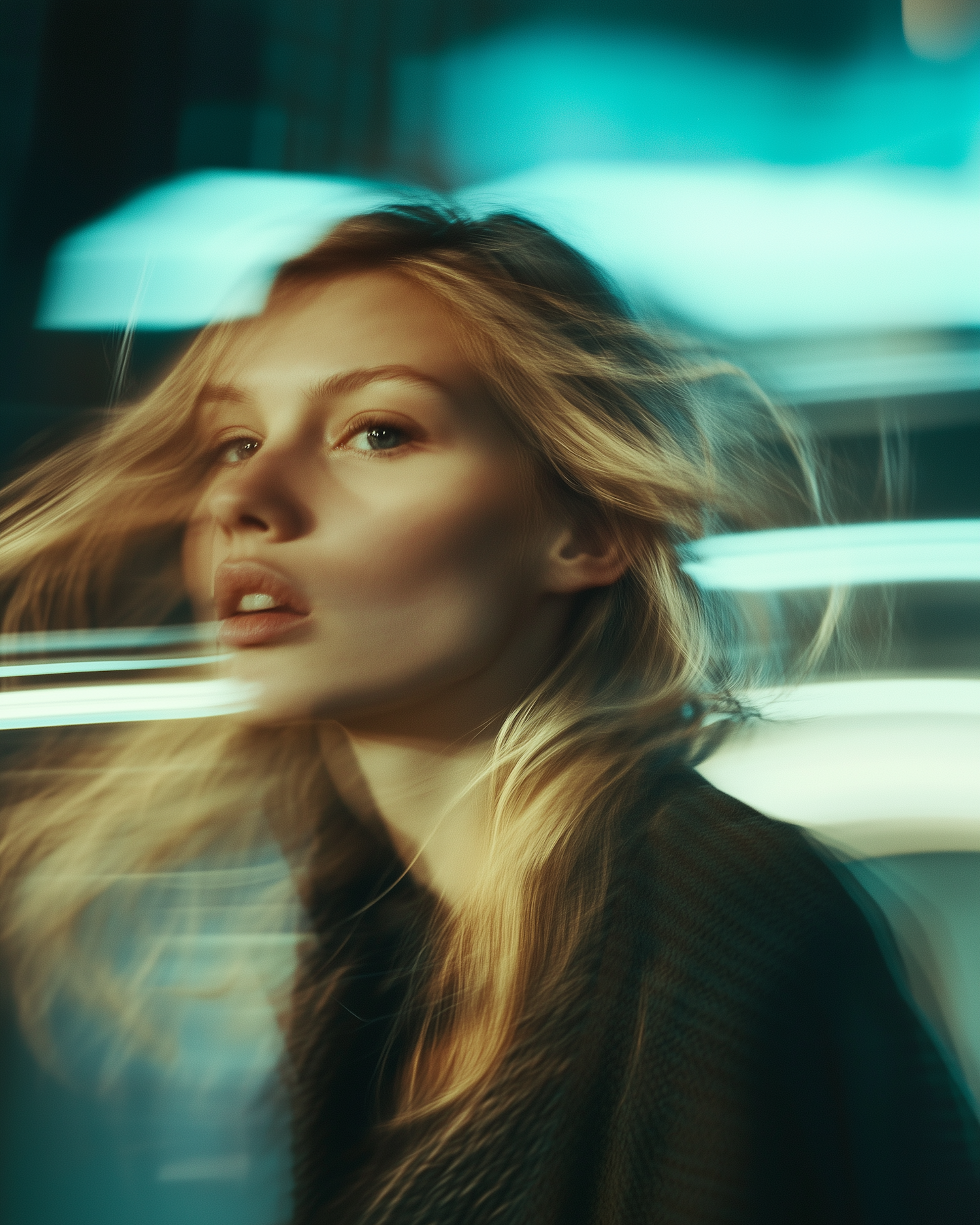 Dynamic portrait of a blonde woman in motion with teal and dark background, capturing energy and modern artistry.