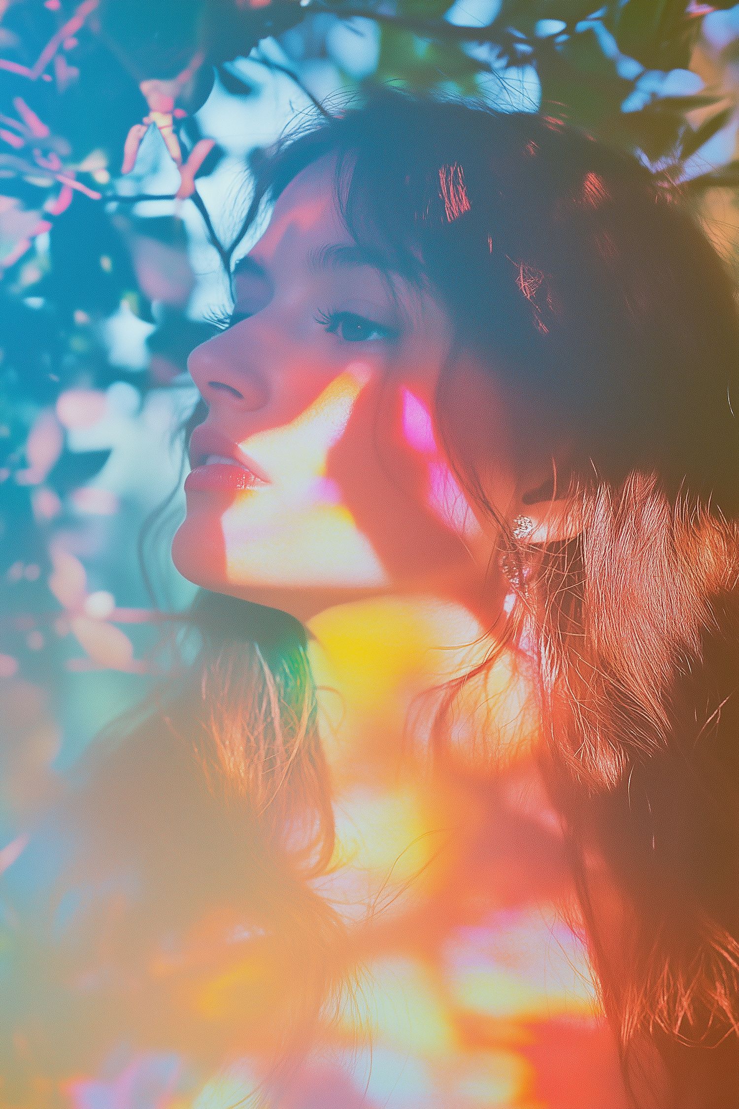 A serene portrait of a woman bathed in rainbow light, with colorful shadows and a dreamy atmosphere.