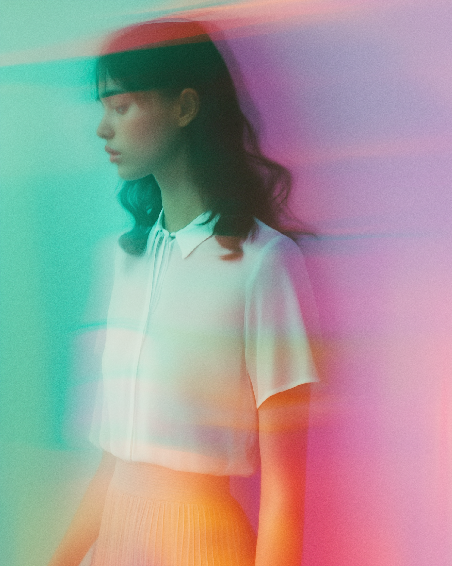 Ethereal portrait of a young woman in profile with a dreamy, colorful blurred background, creating a serene and artistic atmosphere.