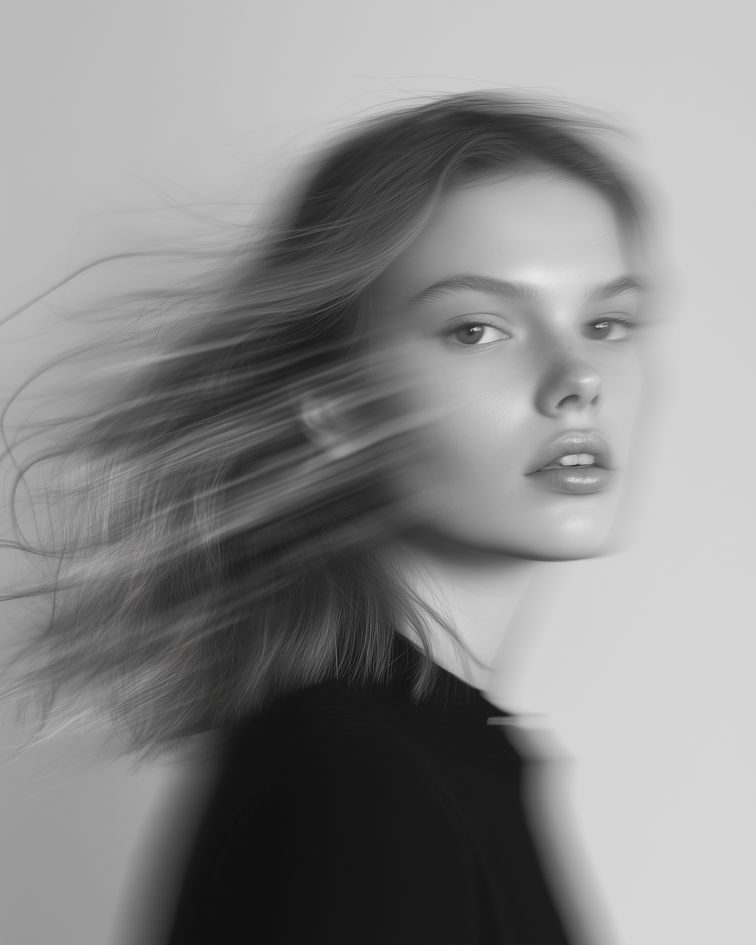 Artistic black and white portrait of a woman with dynamic hair motion, creating a blurred effect against a soft gray background.