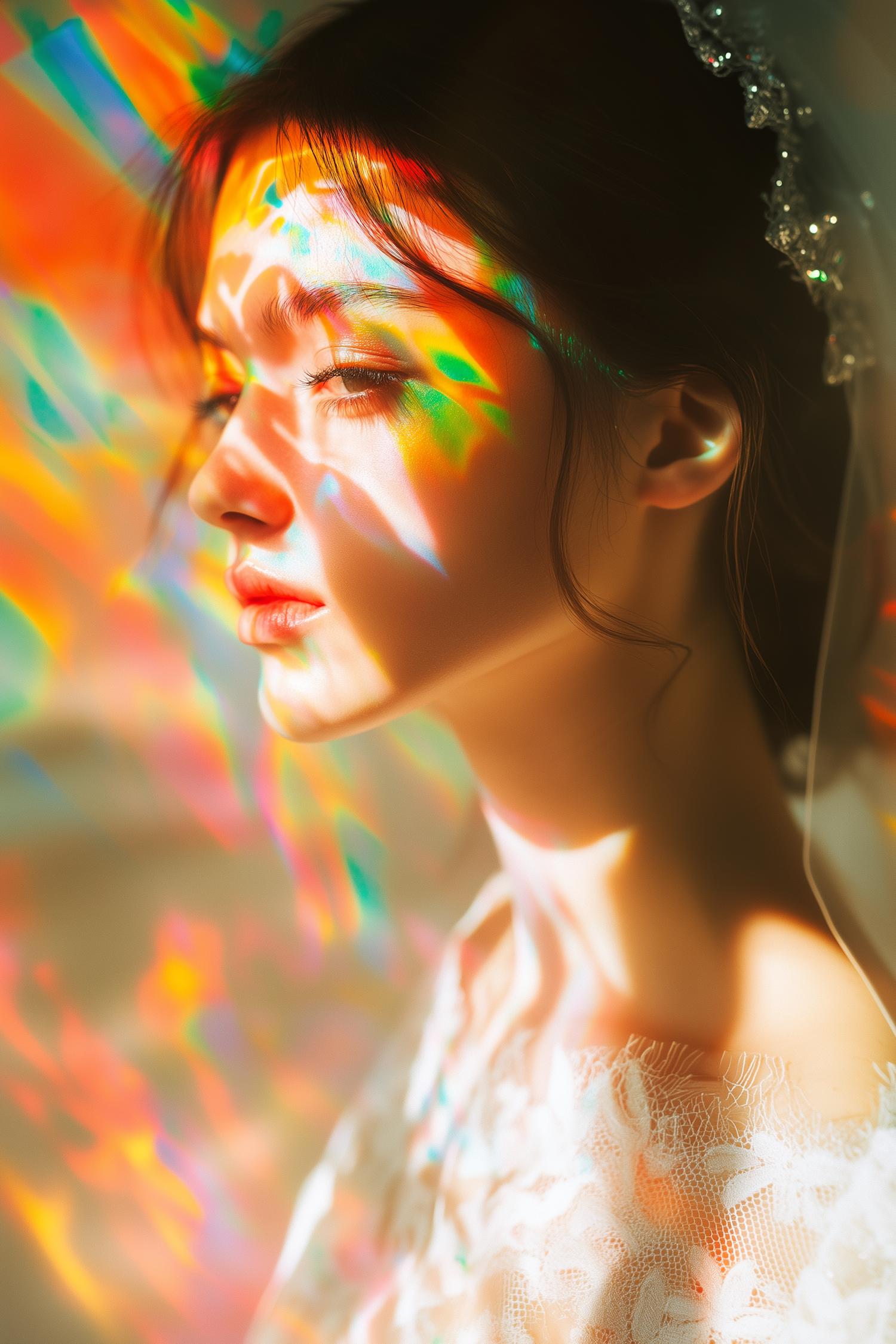 A serene woman in lace with colorful light patterns on her face, creating a dreamy and artistic visual effect.
