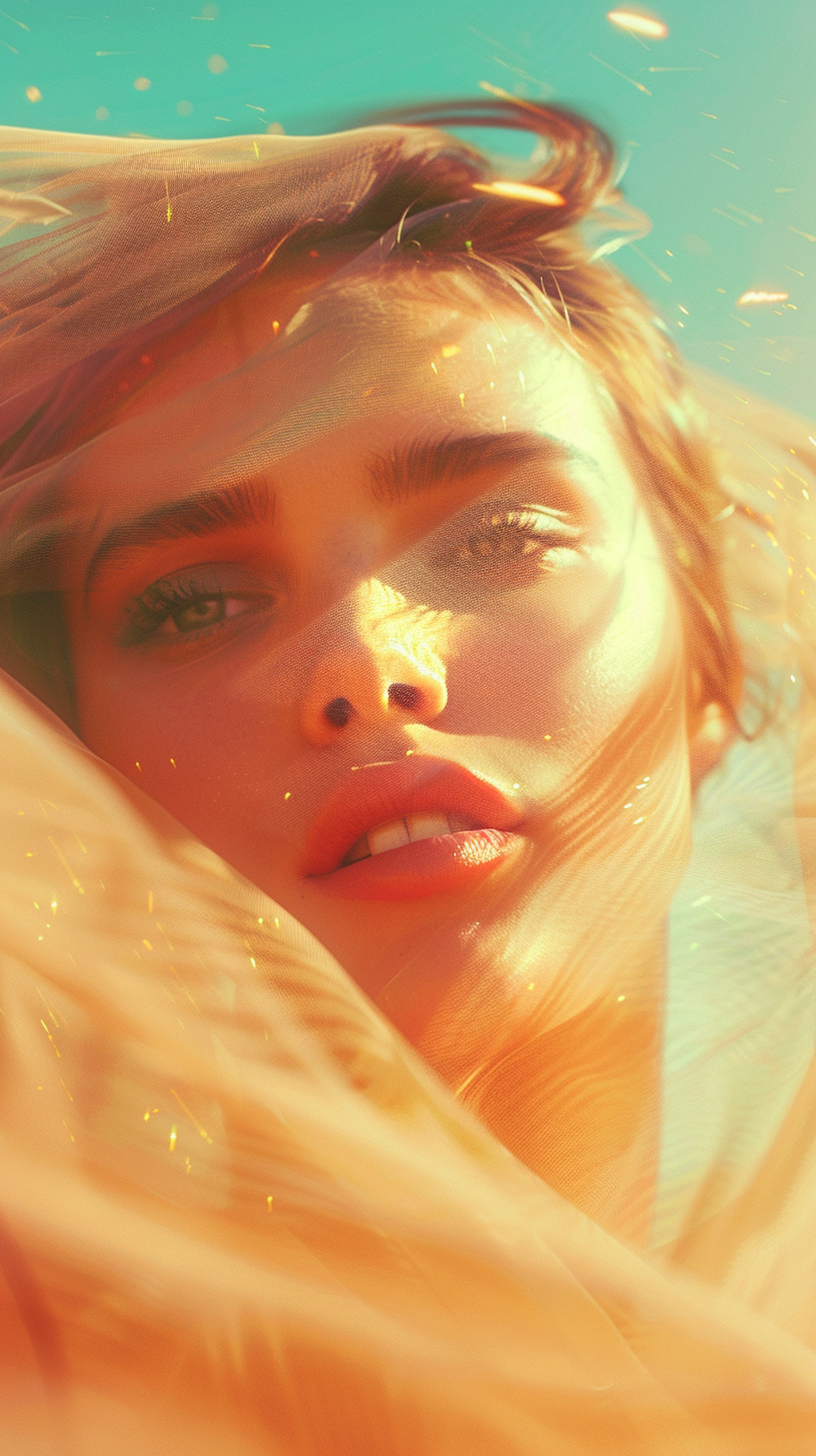 Ethereal portrait of a woman with green eyes and light brown hair, enveloped in golden fabric against a turquoise background.