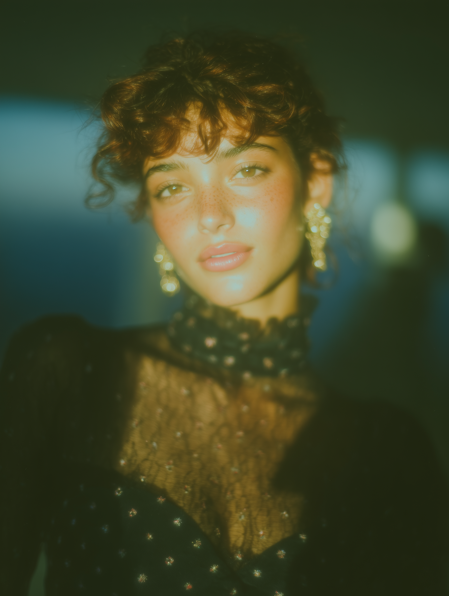 A dreamy portrait of a freckled woman with curly auburn hair, green eyes, and a semi-transparent patterned top in soft, warm lighting.