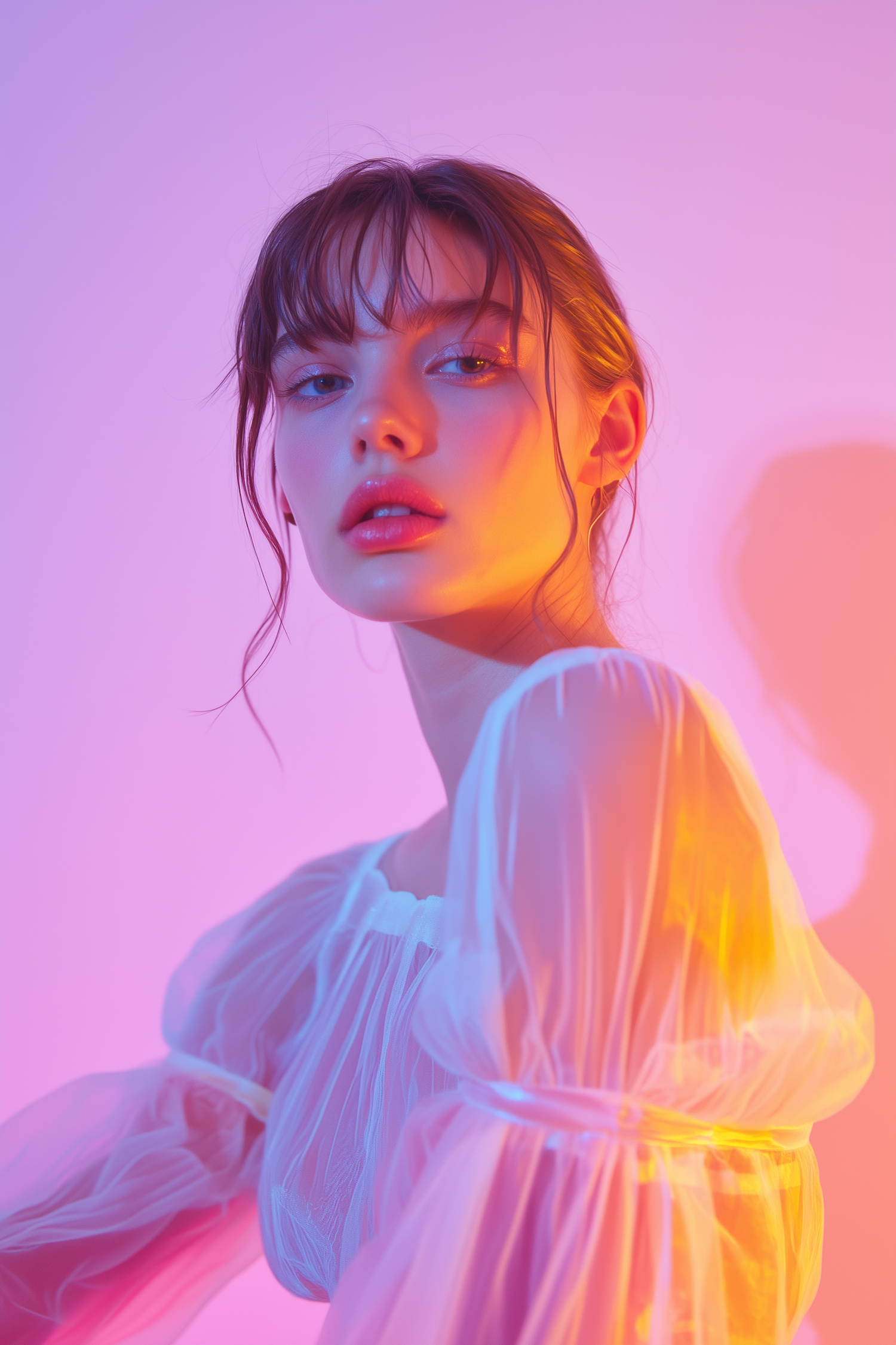 Ethereal portrait of a young woman in soft lighting, wearing a sheer white blouse with warm orange and cool purple tones.