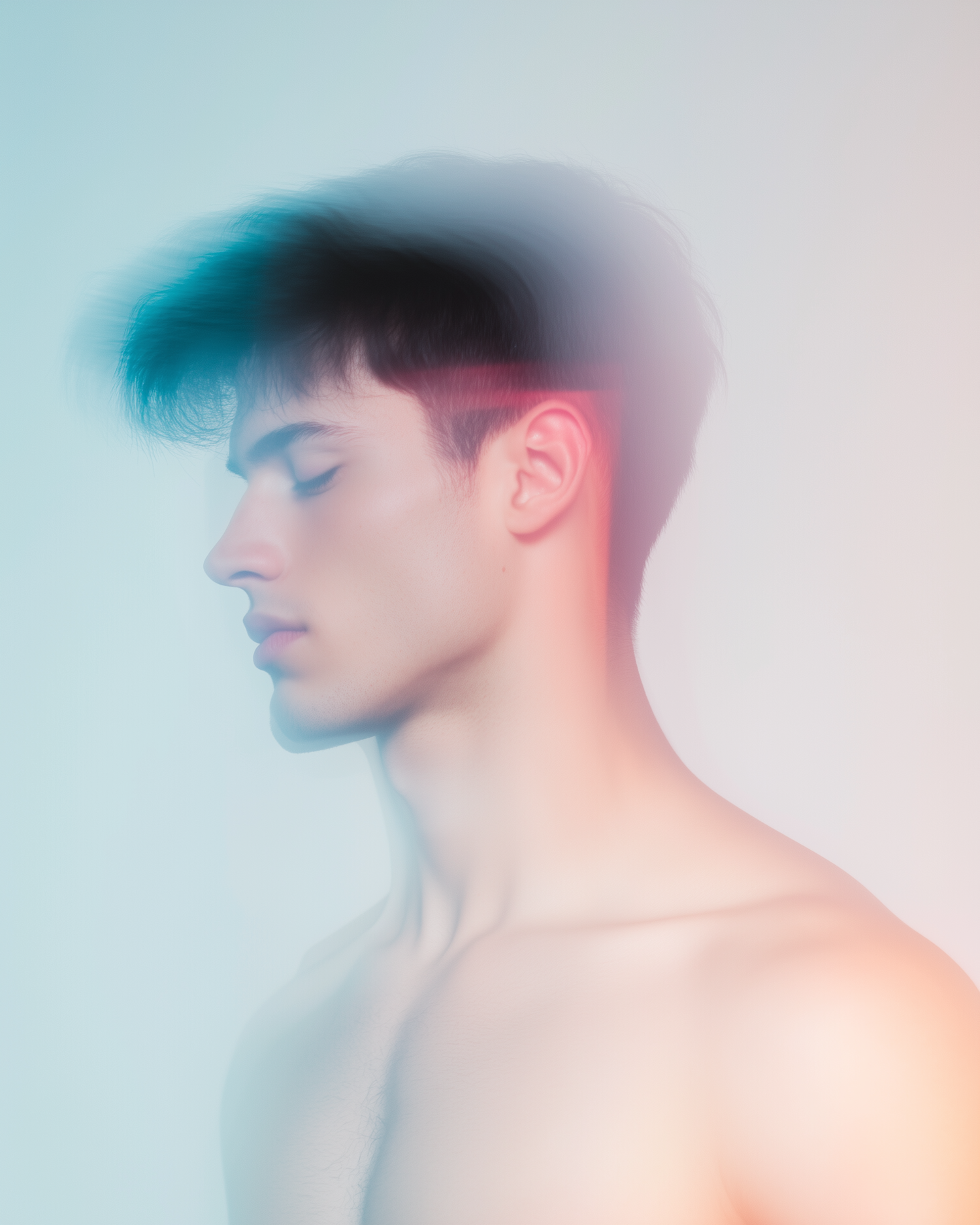 Dreamy portrait of a young man with closed eyes, soft pastel hues, and ethereal lighting creating a serene, artistic vibe.