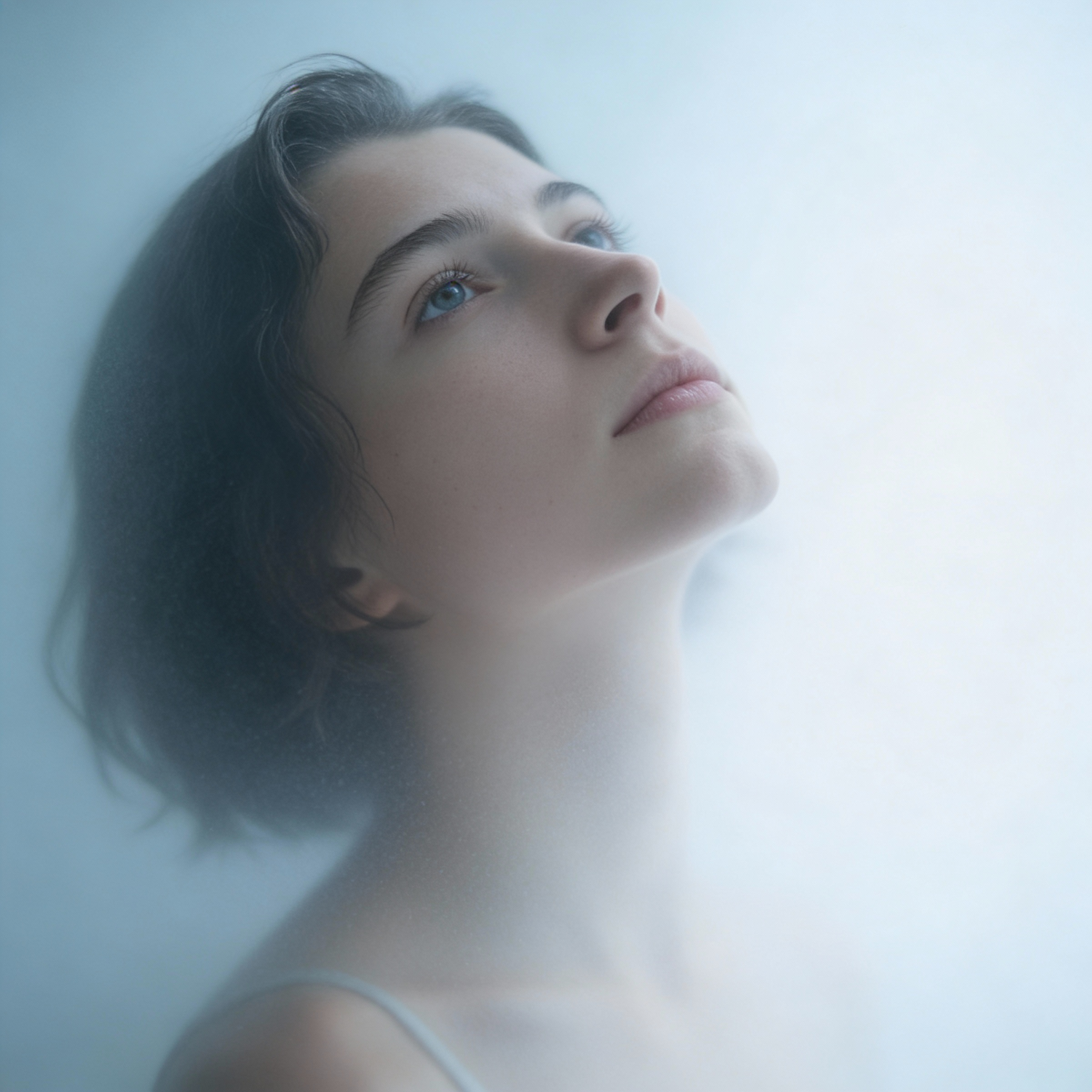 A serene portrait of a young woman with short dark hair and blue eyes, gazing upward in soft, ethereal lighting.