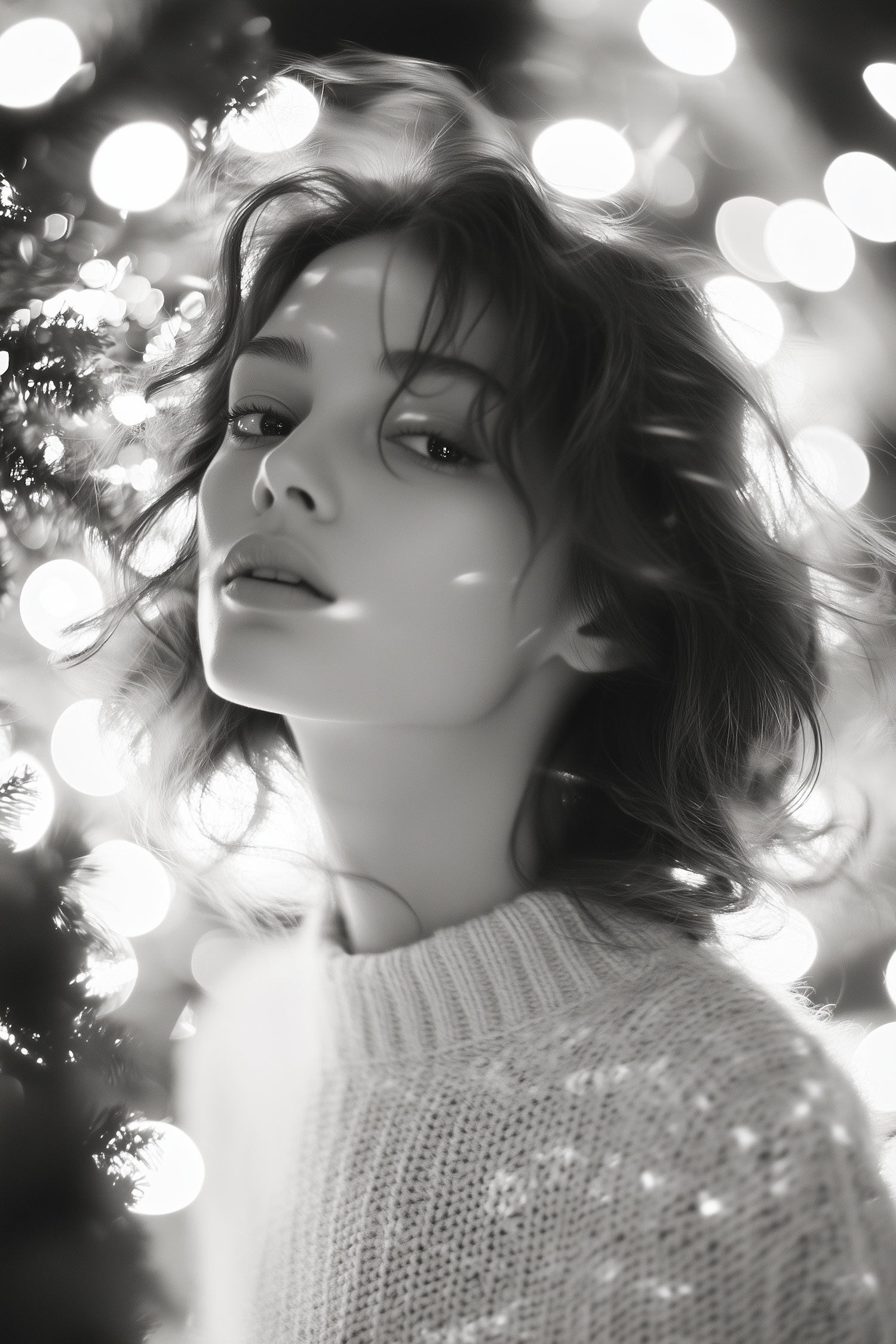 Elegant monochrome portrait of a young woman with soft lighting and a dreamy atmosphere, featuring glowing lights and a cozy sweater.