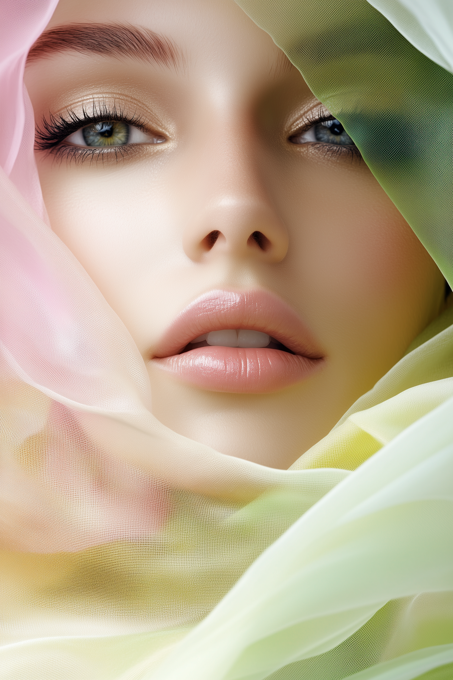 Close-up of a woman's face with green eyes and pink lips, framed by pastel fabric, creating a dreamy and ethereal look.
