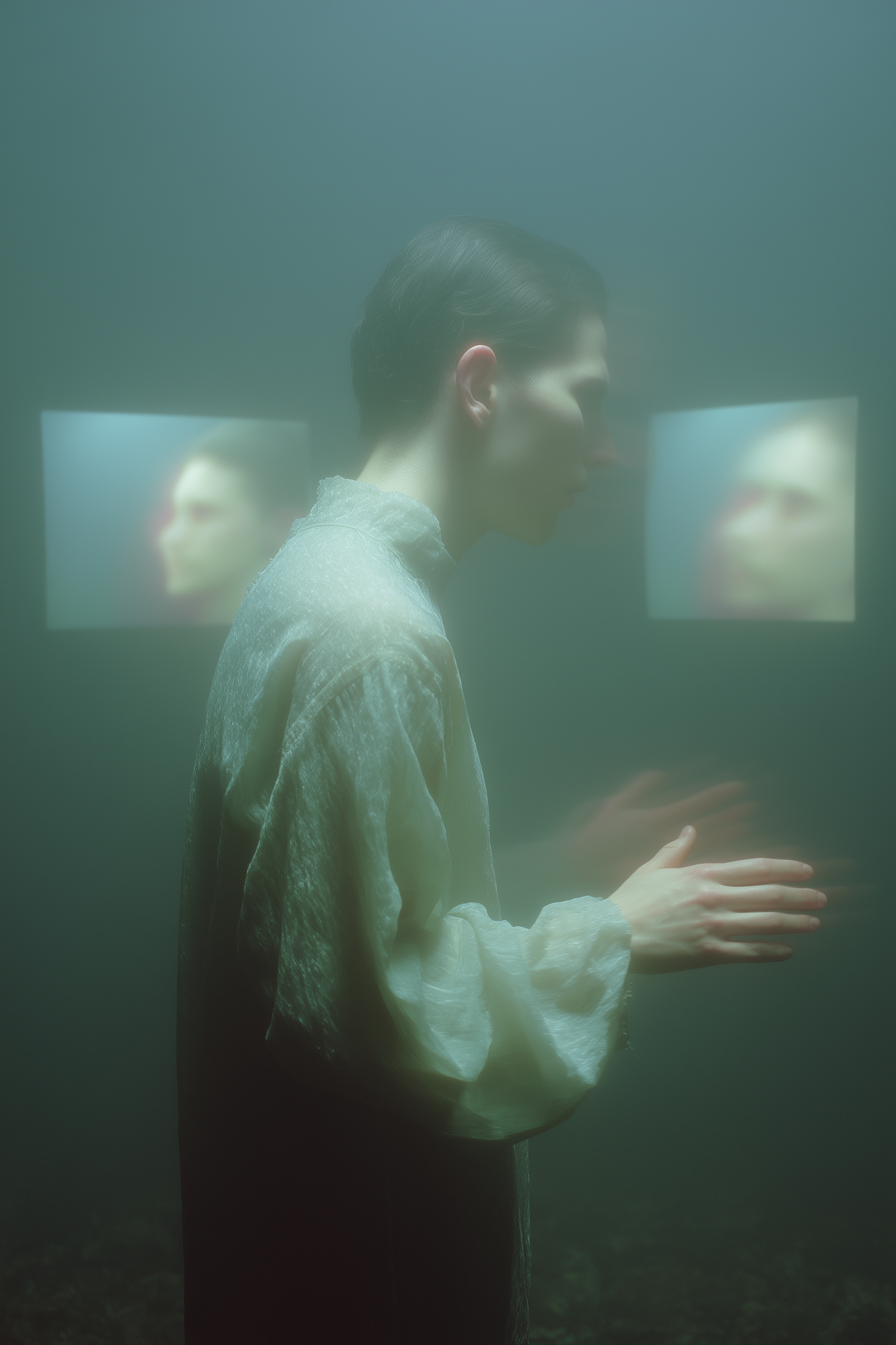 Ethereal image of a person in soft lighting, with mist and diffused portraits in the background. Surreal and contemplative atmosphere.