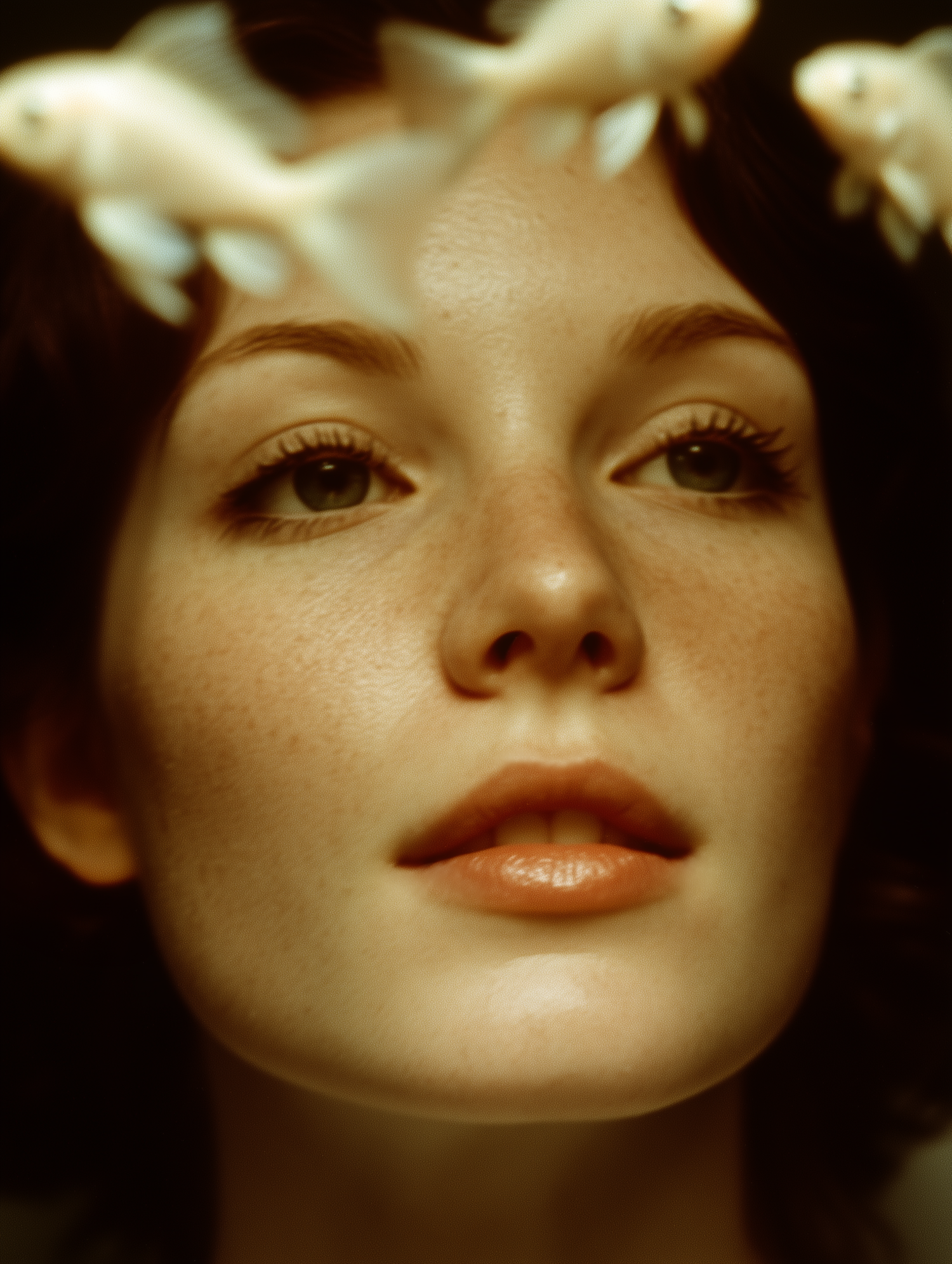 Dreamy close-up of a freckled woman with soft lighting and translucent fish swimming in the foreground, creating an ethereal vibe.