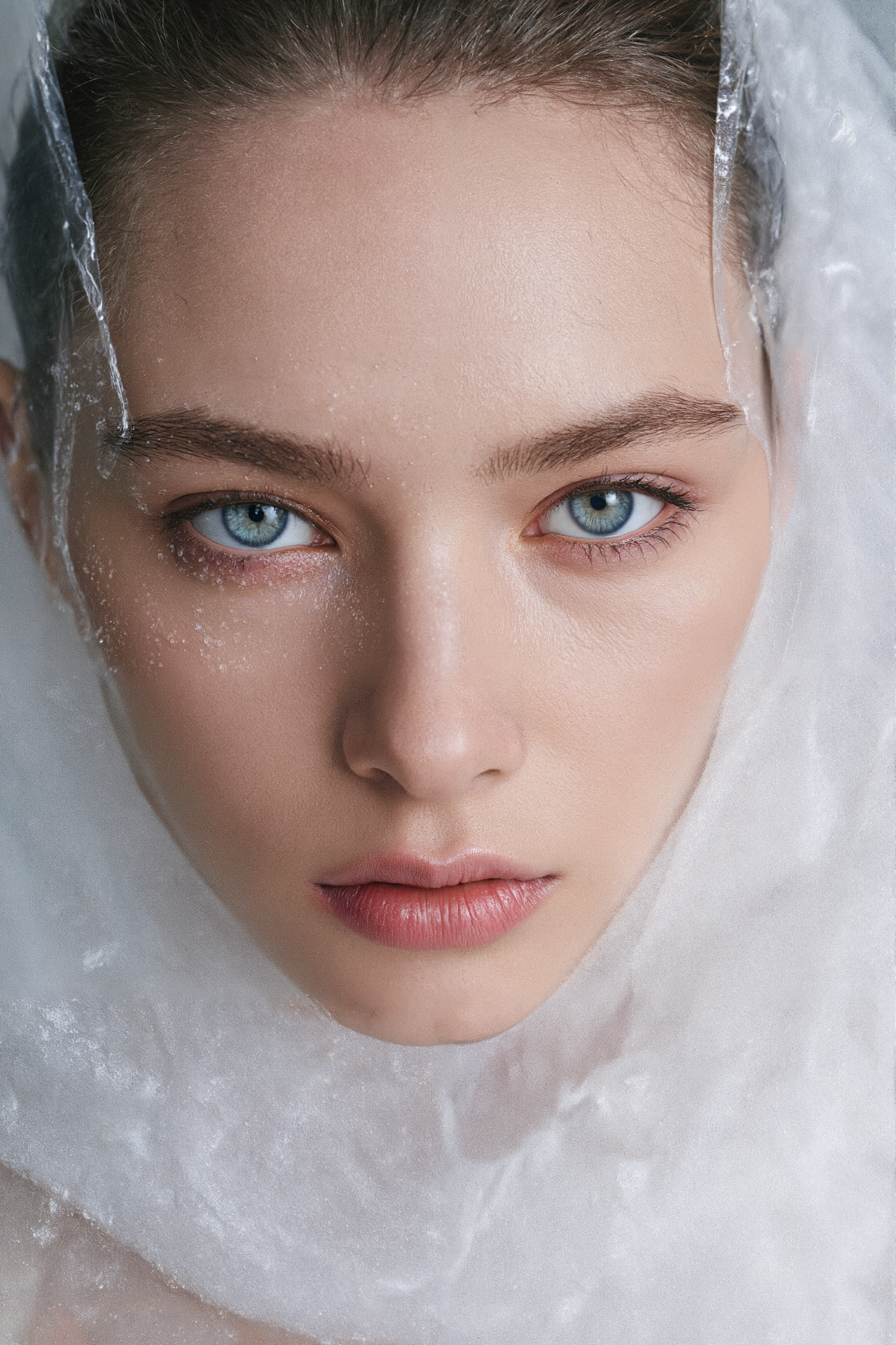 Close-up portrait of a woman with blue eyes and icy texture, creating a serene and ethereal look.
