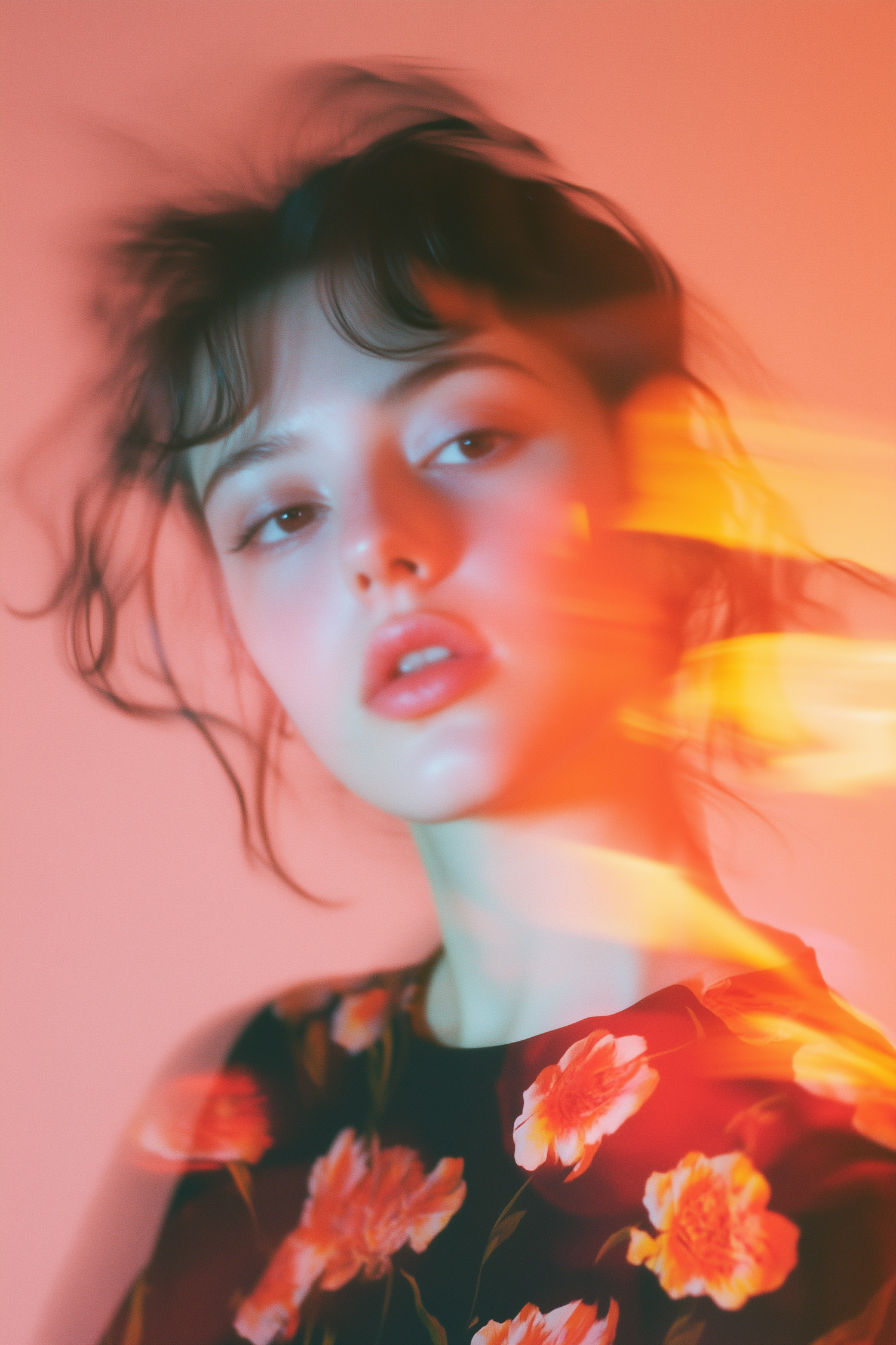 Ethereal portrait of a young woman with a floral dress, warm glow, and dreamy blur effect.
